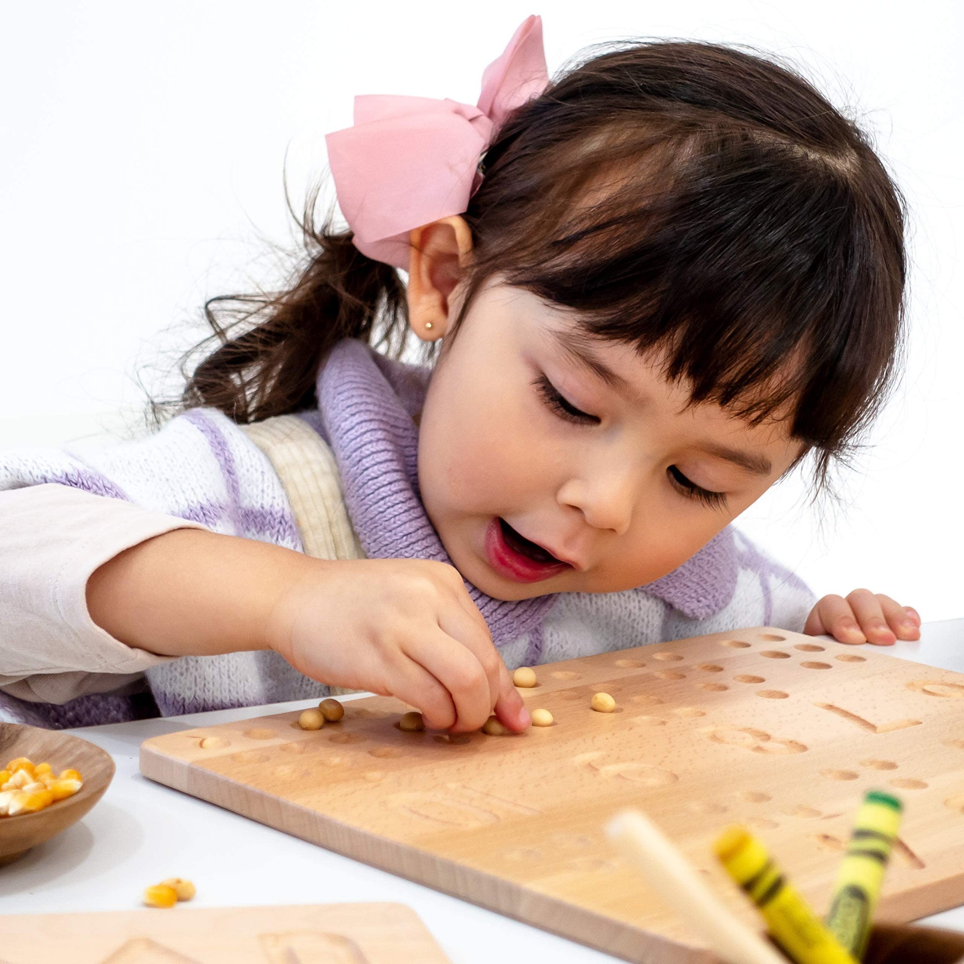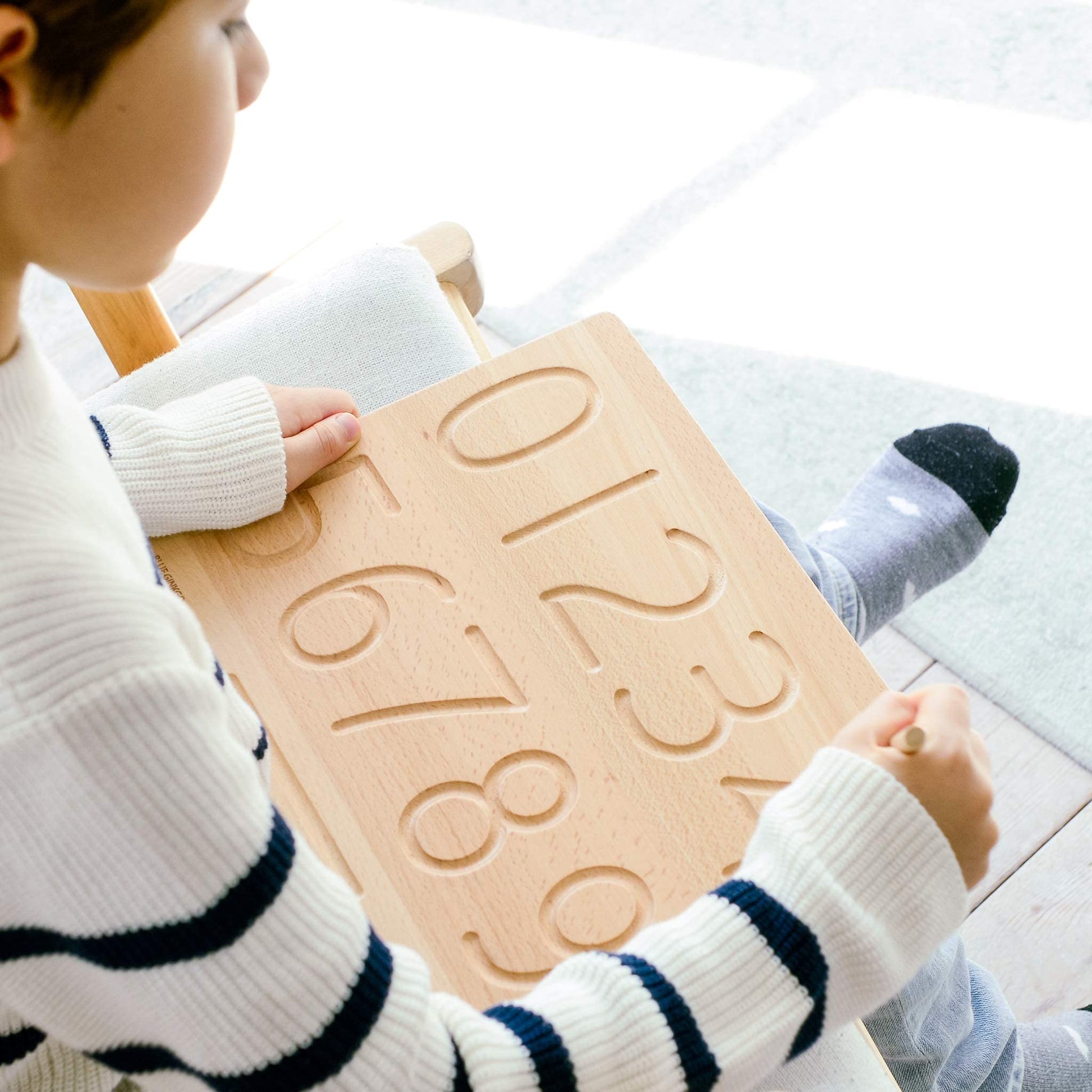 This tracing board makes learning the numbers and counting an interactive and fun experience. With every activity, your child will be able to naturally engage their senses, develop hand-eye coordination, motor skills and experience the joy of numbers. Imagine tracing each number with your finger, making vivid number rubbings, hearing dried beans tap on the board as you practice counting and holding the wooden stylus as you write the number 1 for the first time. Its a hands-on experience that engages the senses, and with numbers on one side and a counting board on the other, your child will have access to the tools they need to learn numbers and start developing basic math skills.