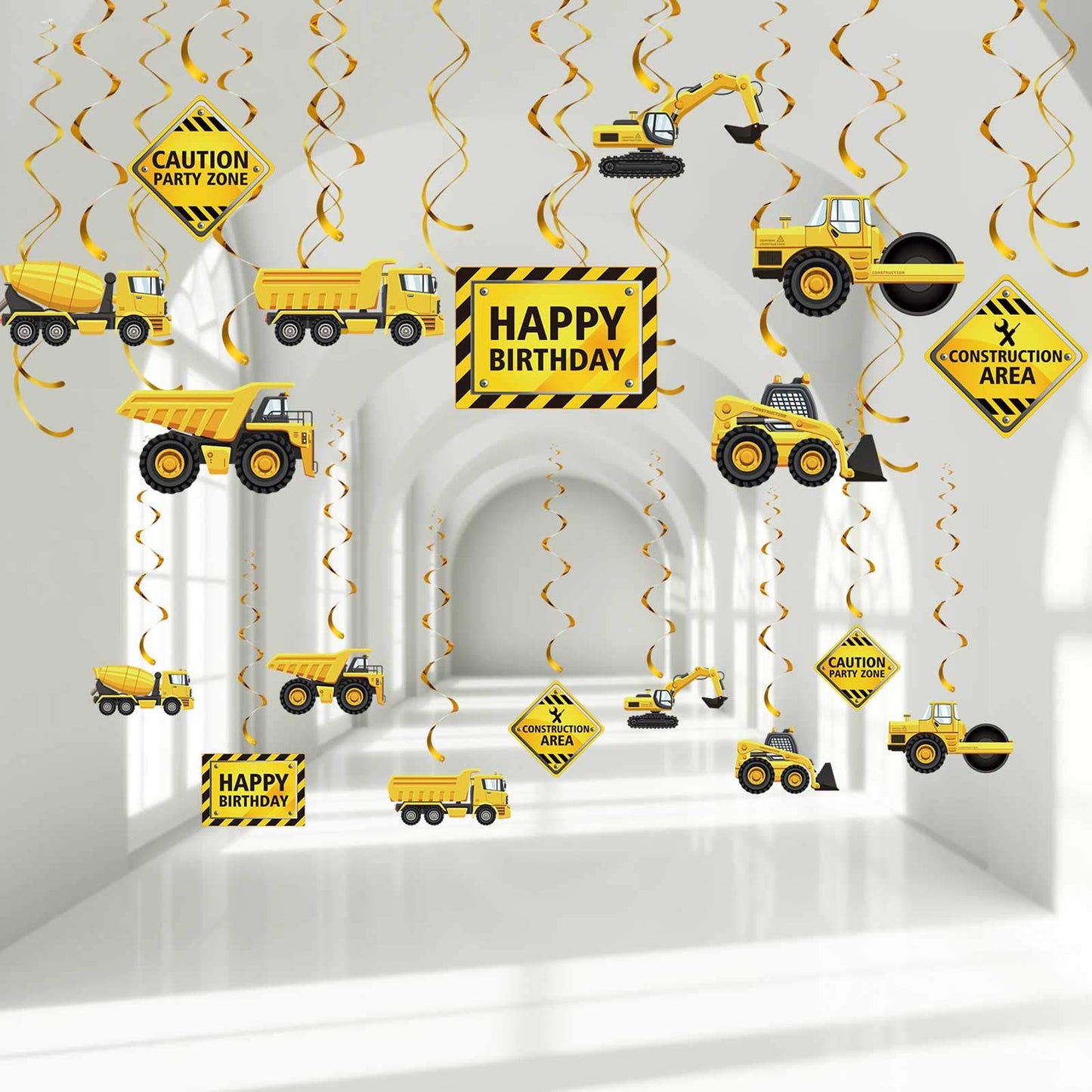 Construction birthday party hanging swirl decorations, caution traffic signs tractor bulldozers dump truck party foil swirls decorations for kids boys construction zone birthday decorations supplies