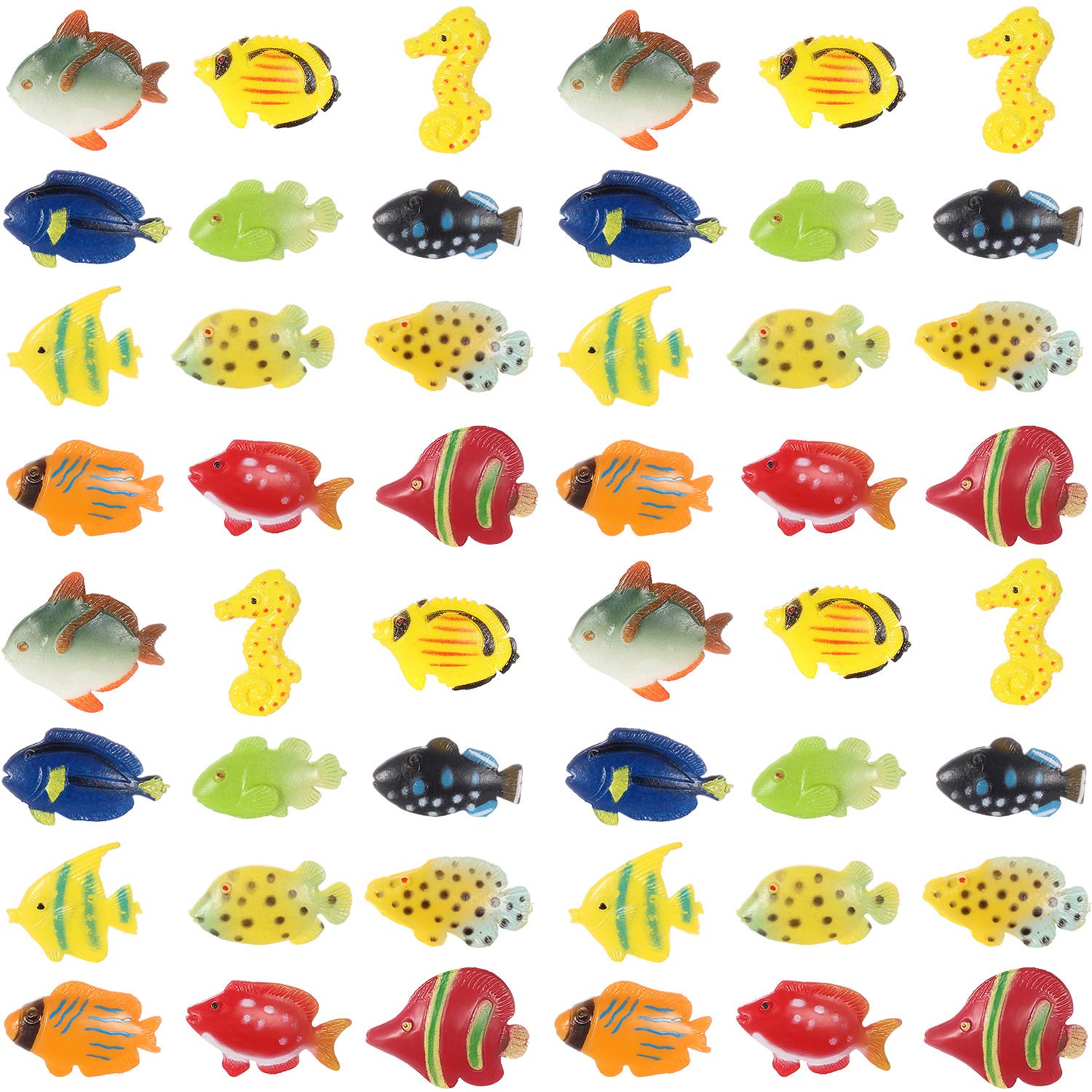 • Q: How many pieces come in the tropical fish figure play set? A: The set includes 48 pieces of colorful tropical fish toys, offering a variety of 12 assorted styles with 4 pieces for each style.