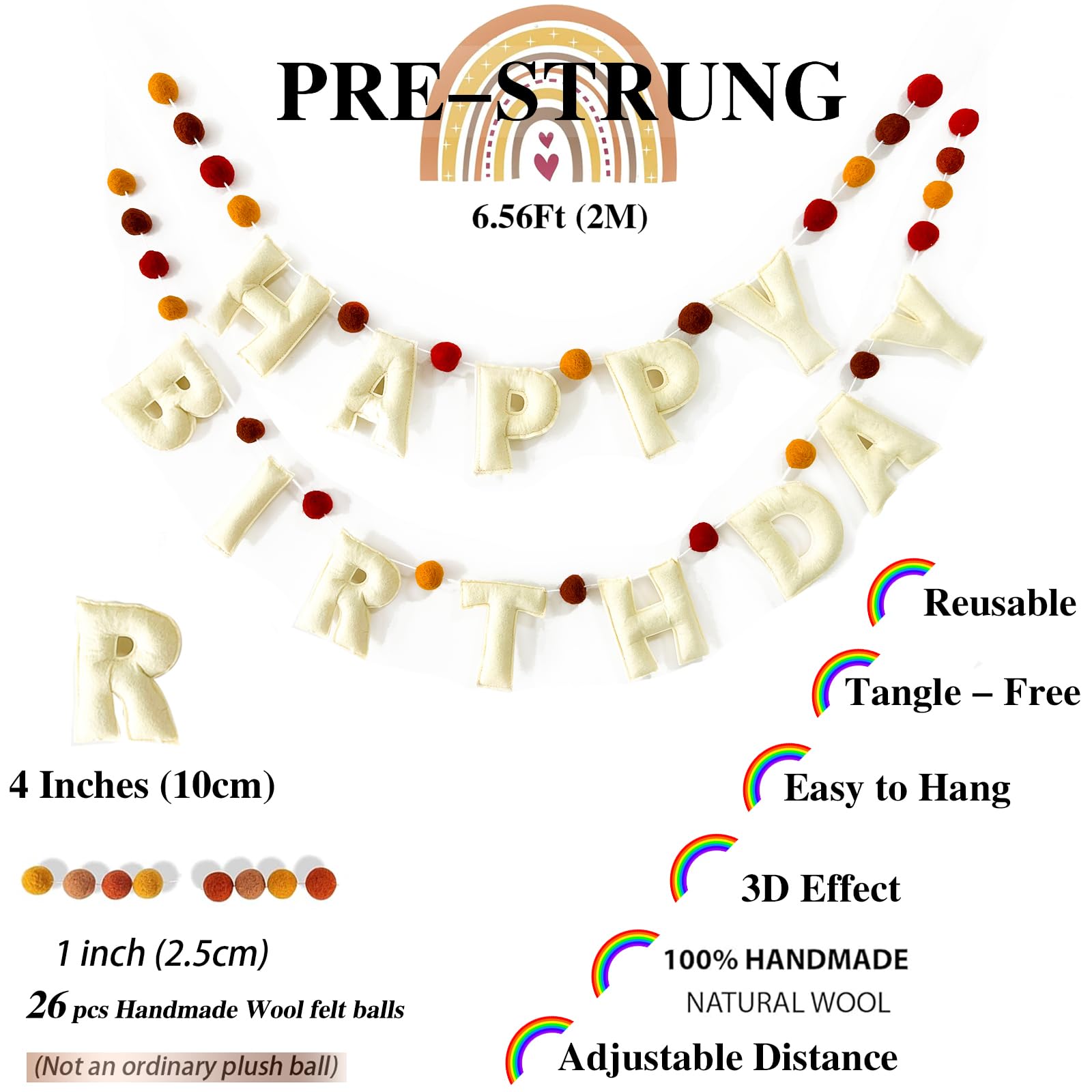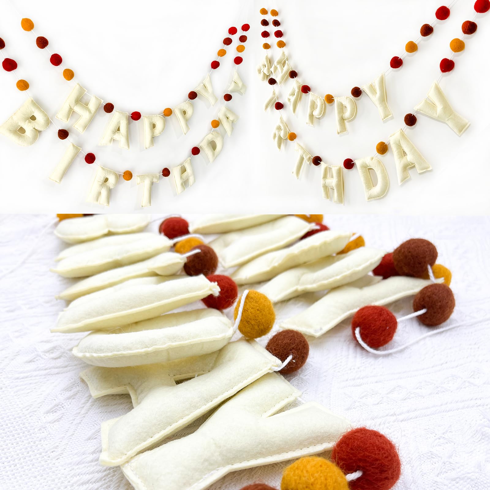 Boho Felt Happy Birthday Banner, Bohemian Birthday Party Decorations,Natural Handmade Wool Letters & Balls, Boho Happy Birthday Garland For Kids Birthday Parties Window Door Mantels Decor Ready To Hang Material And Size: -- Letters Made Of Felt (4 Inches) - 26 Pcs Wool Felt Balls,100% Handmade Of Natural Wool (1 Inches) - Each Letter Already Pre-Strung On Two Separate Coordinating White Twine Strings Why Choose This Happy Birthday Banner? Boho Felt Happy Birthday Banner Our Happy Birthday Garland Is Made From Wool Felt That Has Been Stuffed And Sewn For A 3D Effect. Add A Stunning Backdrop To Your Celebration. Our Fun And Colorful Happy Birthday Banner Is Very Suitable For Any Bohemian Party Theme. It Brings Warm Birthday Wishes To Anyone At Any Age! Pre-Strung, No Diy Required! Easy To Hang Unlike Others, Our Happy Birthday Party Banner Will Arrive To You With Each Letter Already Pre-Strung On Two Separate Coordinating White Twine Strings. Letters And Balls Can Easily Be Moved For Spacing In Between. No Wasted Time Putting Them Together All You Have To Do Is Hang And Youre Ready To Go. The Happy Birthday Garland Is The Perfect Decoration For Your Child'S Birthday Party Or Your Own. Hang Them On The Wall, In A Tree Or Use Them As Table Decorations. Durable & Reusable Material Are You Tired Of Paper Birthday Banners That Only Last For One Party? The Letters Are Made From High Quality Felt That Has Been Carefully Cut Out And Sewn Together. It Will Last For Years! This Happy Birthday Garland Can Be Reused Year After Year. Whether It'S For Your Child'S Birthday Or Your Own, This Garland Will Set The Mood For Celebration. Perfect Birthday Decorations Our Happy Birthday Felt Ball Garland Is The Perfect Accent For Birthday Party Decor, Childrens Bedroom, Kids Teepee, Playhouse, Playroom Or Home Decor. Our Birthday Banner Comes In A Vibrant Color That Will Brighten Up Any Space.You Can Place These Felt Birthday Garlands On Your Mantel, Dining Room, Playroom, Or Anywhere Else In Your Home To Add A Pop Of Color. Have A Nice Birthday Party 24-Hour Online Customer Service , Do Not Hesitate To Contact Us If You Have Any Questions , Our Team Is A Reliable And Professional Manufacture Of Party Supplies. We Must Try Our Best To Improve Our Service And Products Quality , Hope You Are Satisfied With The Product. Due To The Different Display And Lighting Effects, The Actual Color May Be Slightly Different From The Image. Please Allow 0.5-1Cm Measuring Deviation Due To Manual Measurement.