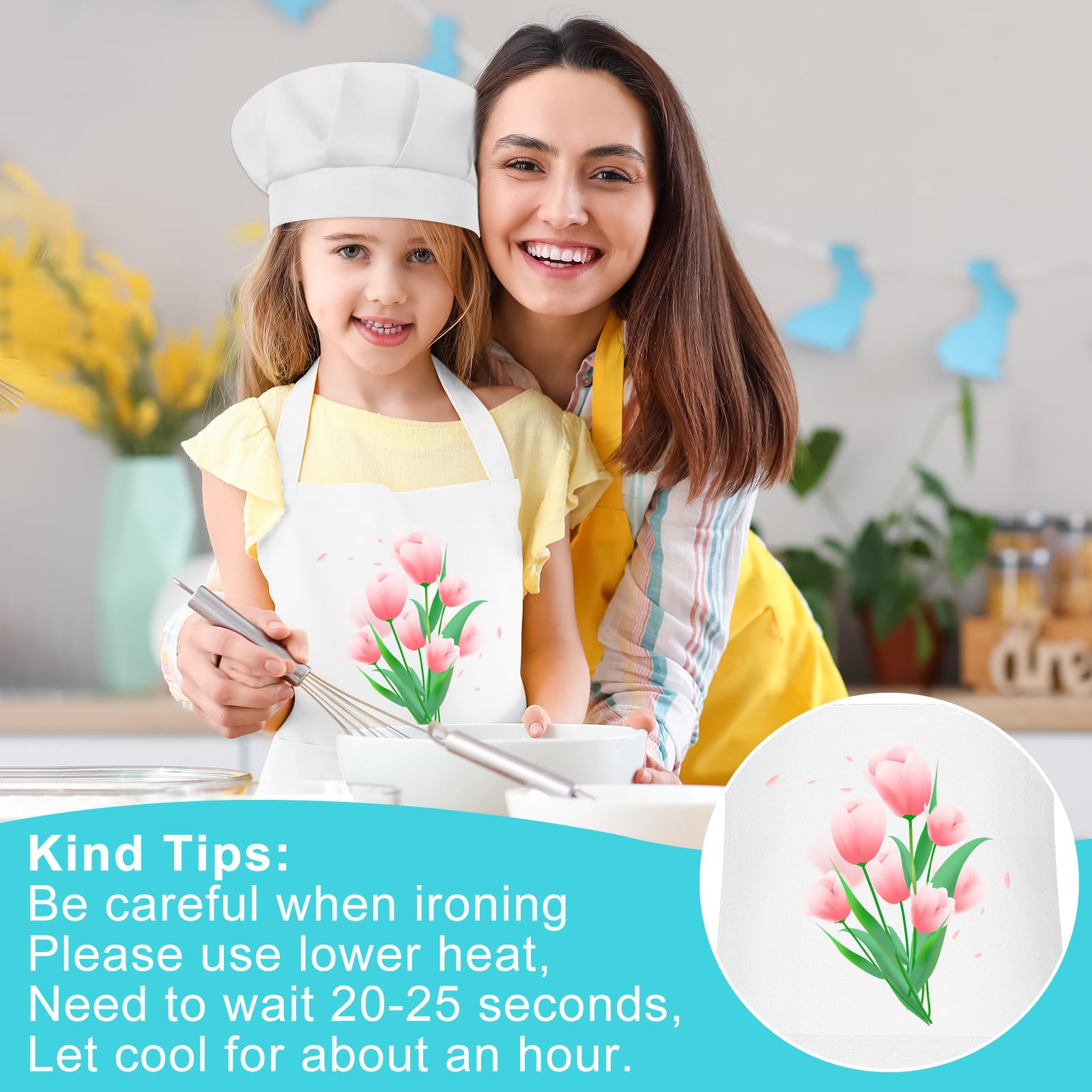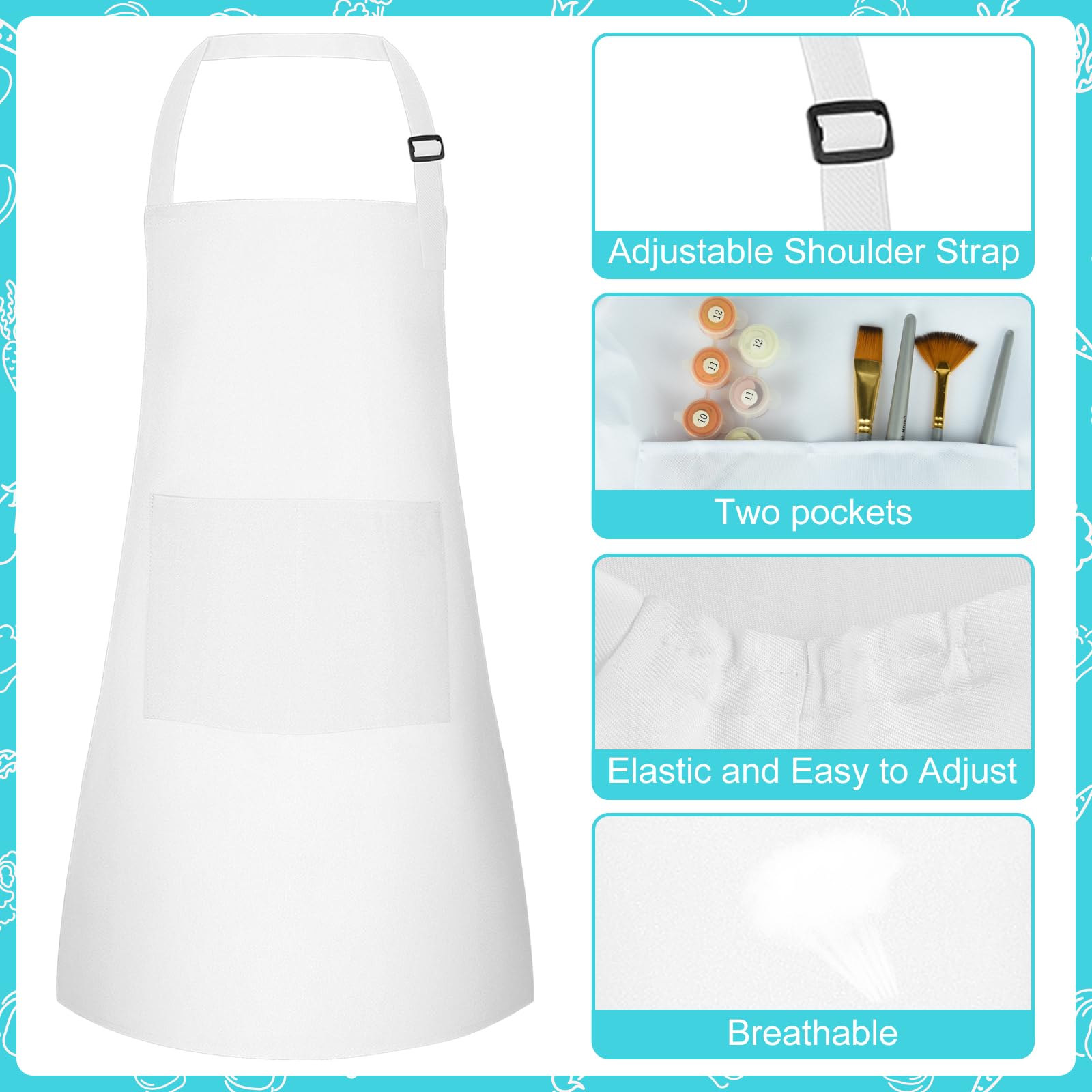 Specifications: Material: Polyester Color: white Size: Kids aprons measure 24*18 inches with 2 pockets, chef hats measure 10 inches What you will get: Kids apron and chef hat set(1 set of white) Notes: Handmade, please allow slight size error Due to different screen displays, there may be slight differences in color