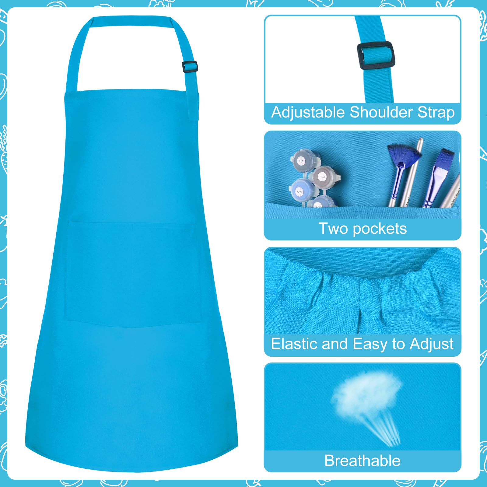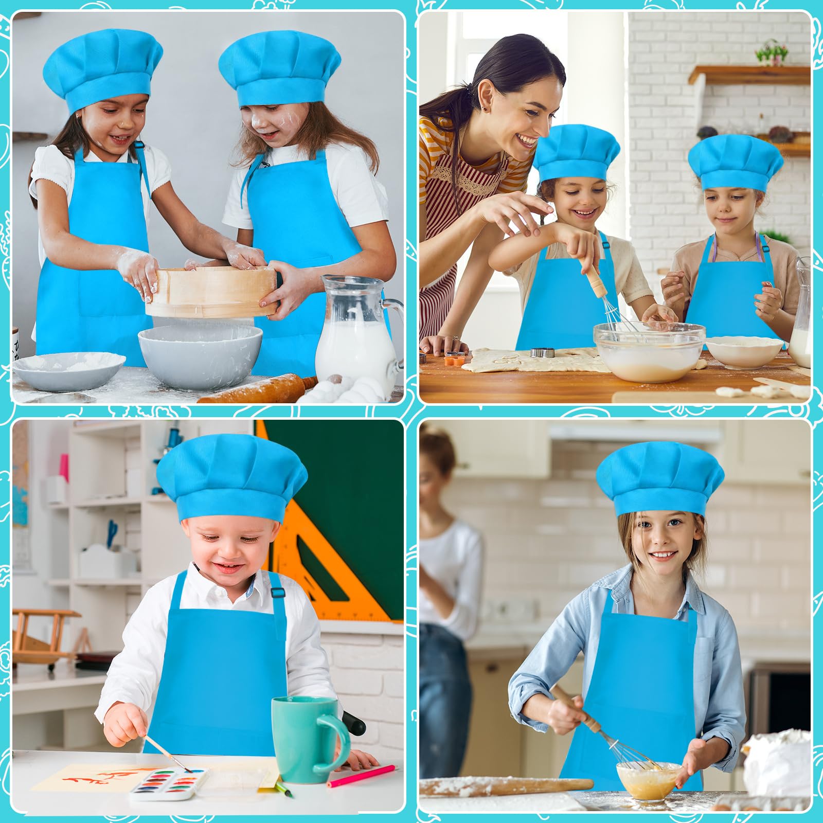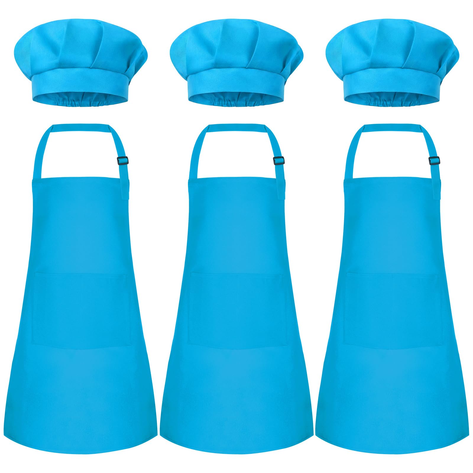 Specifications: Material: Polyester Color: Blue Size: Kids aprons measure 24*18 inches with 2 pockets, chef hats measure 10 inches What you will get: Kids apron and chef hat set(3 set of Blue) Notes: Handmade, please allow slight size error Due to different screen displays, there may be slight differences in color