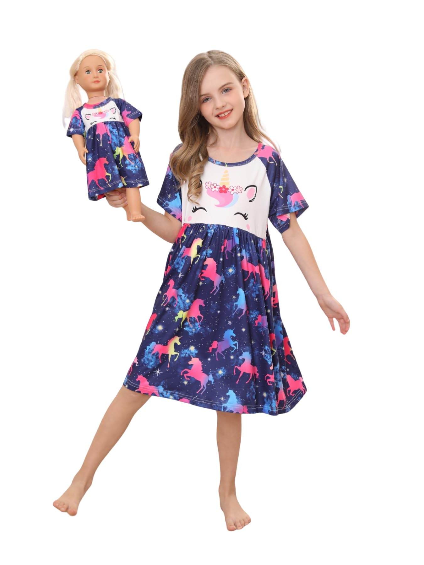 Great gift for girls.The matching baby doll clothes and girl dress set looks super cute, suitable for all seasons. An ideal gift for birthday, Christmas, holidays, family gathering or special occasions, to bring in sweetest dreams for kids. | Gift for both girl and 18 inch American dolls. The two dresses feature in adorable matching patterns.It is perfect for girls and American girl dolls. | The dresses are made by 90% quality polyester with 10% elastane, the fabric is super soft and breathable with stretch, great for girls and American girl dolls to wear. | 3D floral Prints make american doll accessories beautiful and attractive. | The 18 inch baby doll clothes is one size . A snap on the back make it easy to handle.