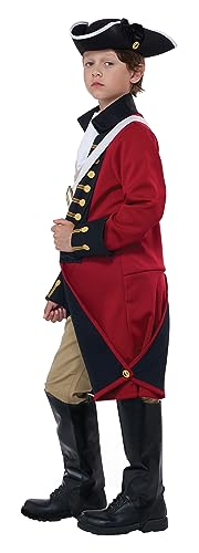 An 18th century British style army uniform. This child British Redcoat costume includes jacket with attached vest cravat chest belt and boot tops. Shoes and decorative replica blade not included. Hat and wig sold separately.