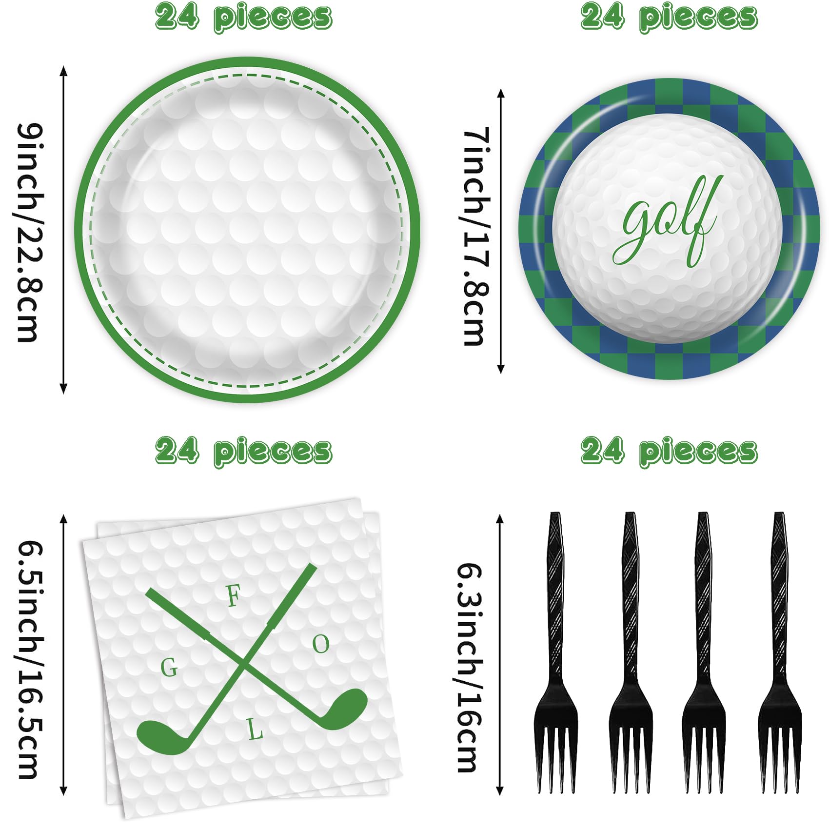 Package Includes: 24Pcs 9*9 Inches Golf Plates For Party 24Pcs 7*7 Inches Golf Plates 24Pcs 6.5*6.5 Inches Golf Napkins 24Pcs 6.5*6.5 Inches Forks 96 Pieces In Total. These Golf Birthday Supplies Will Be Sufficient To Meet Your Needs For Serving 24 Guests.