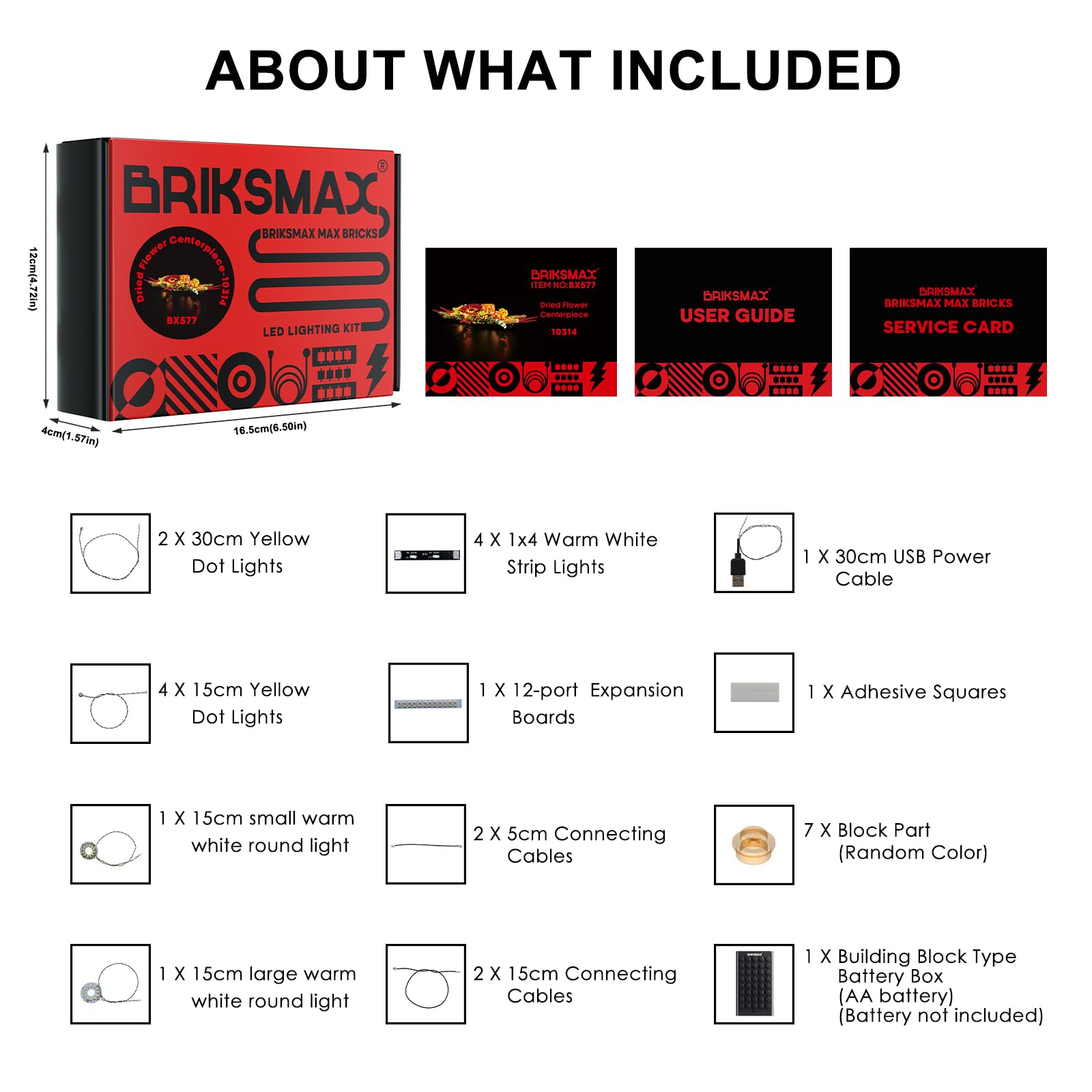 • Q: Can I use the BRIKSMAX lighting kit for other decorative purposes? A: While the kit is designed specifically for the Lego-10314 Dried Flower Centerpiece, you may use the lights creatively for other projects or displays, but results may vary depending on the setup.