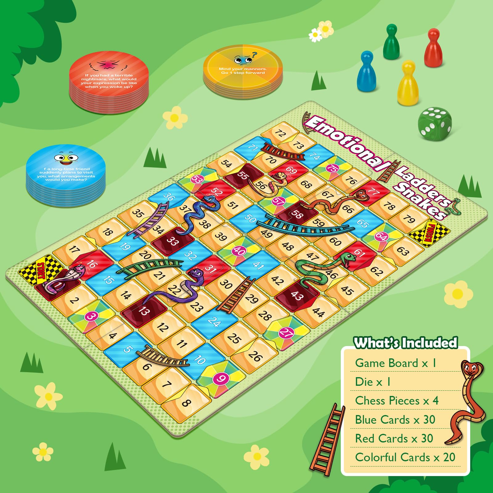 - Q: What are the components included in the game? A: The Broytain Emotional Ladders and Snakes Board Game includes one game board, a dice, four game pieces, and a total of 80 cards (30 blue, 30 red, and 20 random cards) that provide various challenges and scenarios for players.