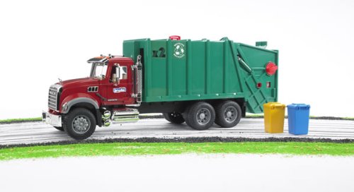 Product DescriptionThe incredibly realistic driver's cabin with its opening doors, tilting engine bonnet providing a view of the engine block, foldable rear-view mirrors, and numerous add-on accessories giving the model its chrome look, create a true feast for the eyes of every truck fan. When used as a garbage truck, this vehicle captivates children with recycling and waste management. The small colored dustbins (included) or the gray dustbins (not included) can be emptied using a fully functional dustbin lift. Both the colored dustbins and the waste container can be opened. In a lifelike manner, a working press transports the garbage to the interior loading container, which can be emptied by tilting the tailgate; securely locking in place when opened.From the ManufacturerMACK Granite Garbage truck (ruby red-green). Engine hood opens to reveal engine, doors open, mirrors fold out. Tilting refuse container can be opened. Real working press. Tires have real tread.