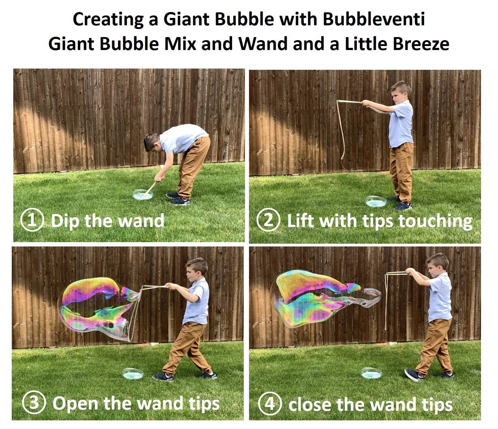 - Q: What is included in the Bubbleventi Giant Bubble Kit? A: The Bubbleventi Giant Bubble Kit includes two sturdy wooden wands, over five feet of rope for large bubbles, a bottle of plant-based giant bubble powder that makes four gallons of bubble solution, and a tips and tricks booklet with instructions and FAQs.