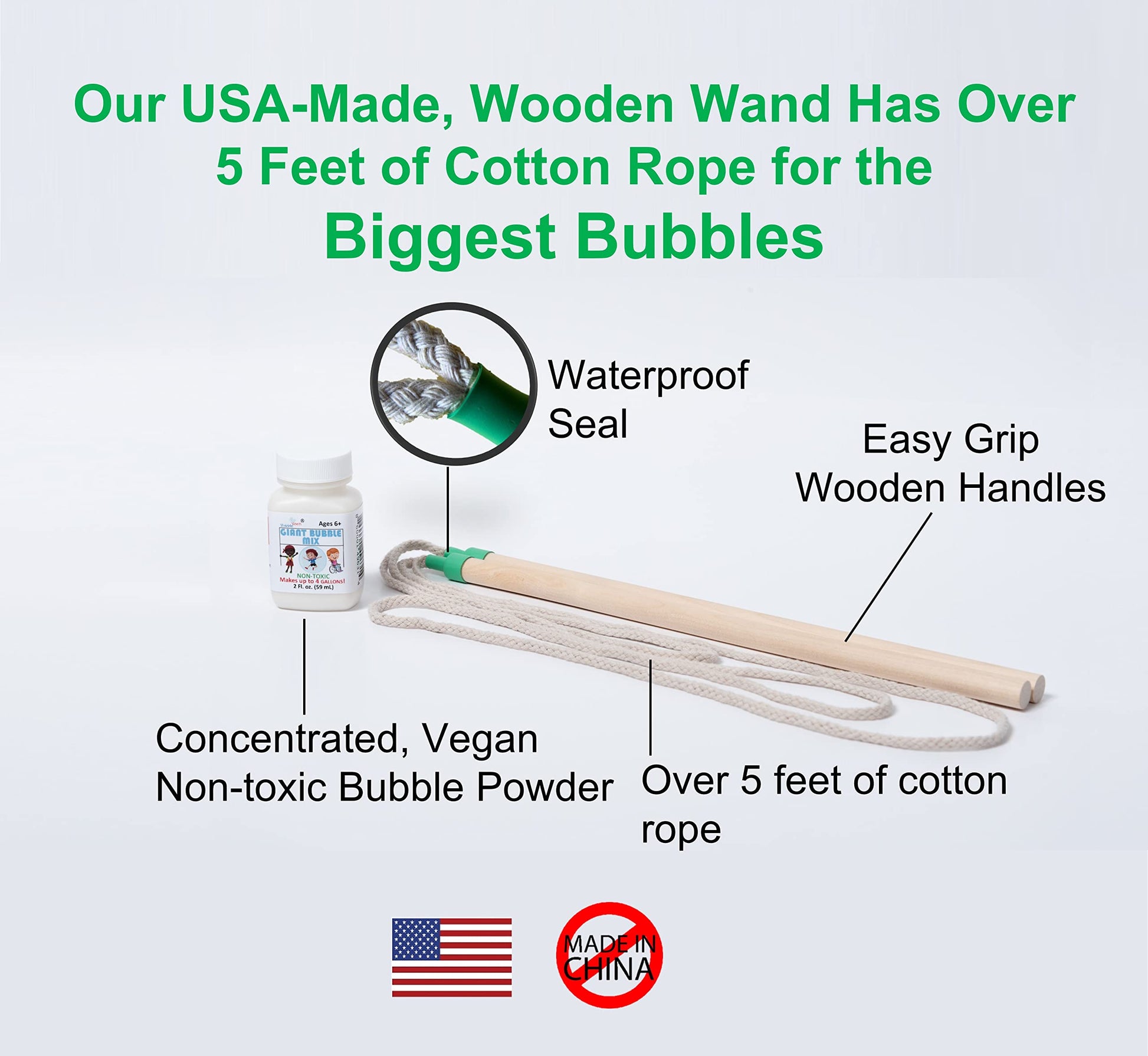 KEY FEATURES:- COMPLETE SET: Your kit includes (1) two sturdy wooden wands with over five feet of rope for creating the largest bubbles; (2) a bottle of plant-based giant bubble powder, which can make four gallons of premium bubble mix when combined with tap water and quality dish soap like Dawn Ultra; (3) a booklet with easy-to-follow instructions, tips, FAQs, and a QR code for access to free instructional videos.