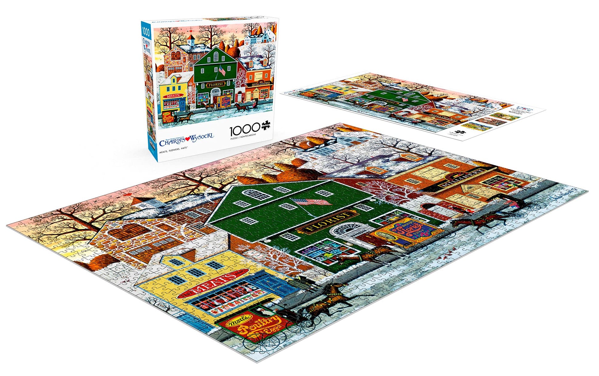 This 1000-piece jigsaw puzzles, Meats, Flowers, Hats, by Buffalo Games is based on the work of artist Charles Wysocki. Visit a butcher shop, florist, and millinery in this nostalgic New England town. Snow is just starting to fall and the trees have lost their leaves in this classic winter scene. For more than 40 years Charles Wysocki enjoyed his love affair with life and Americana, and through his imaginative and colorful artwork, touched the hearts of millions worldwide. 'Chuck' felt a special kinship with puzzlers who share in the creative process by building his paintings one piece at a time. Every Buffalo Games jigsaw puzzle is manufactured from recycled puzzle board. A precision cutting technique guarantees that every piece will fit soundly with the company's signature Perfect Snap™. A bonus puzzle poster is also included so that you have a handy reference of what the completed puzzle should look like while you put yours together.