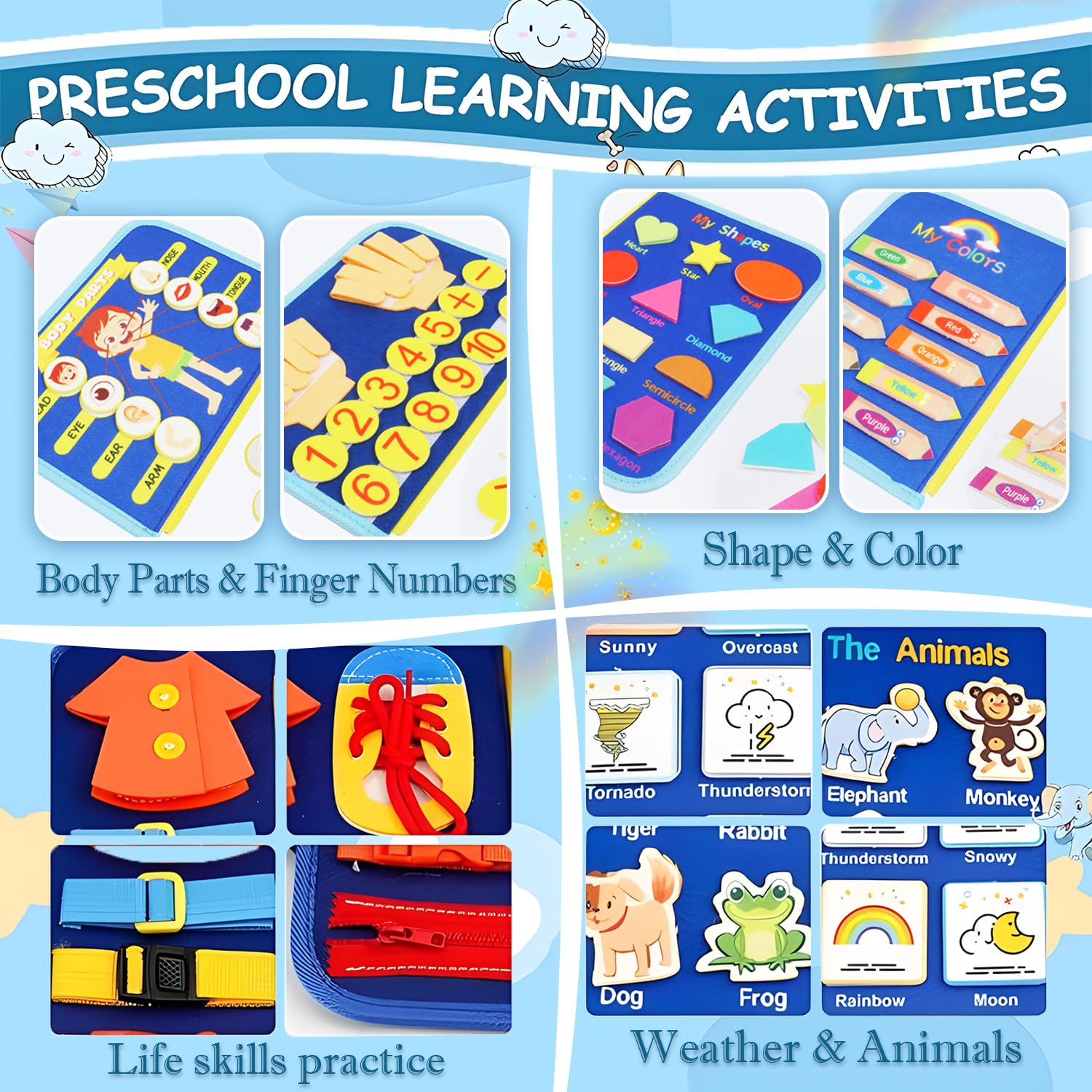 8 in 1 Busy Board for 1+ Toddler - Different from other busy book, Not only does it contain practical life skills, color recognition, and letters of the alphabet, but it also has new additions such as weather, animals, and finger plays - all the things toddlers love to play with and need to learn. It makes a great quiet time toy, which can provide relief for parents.