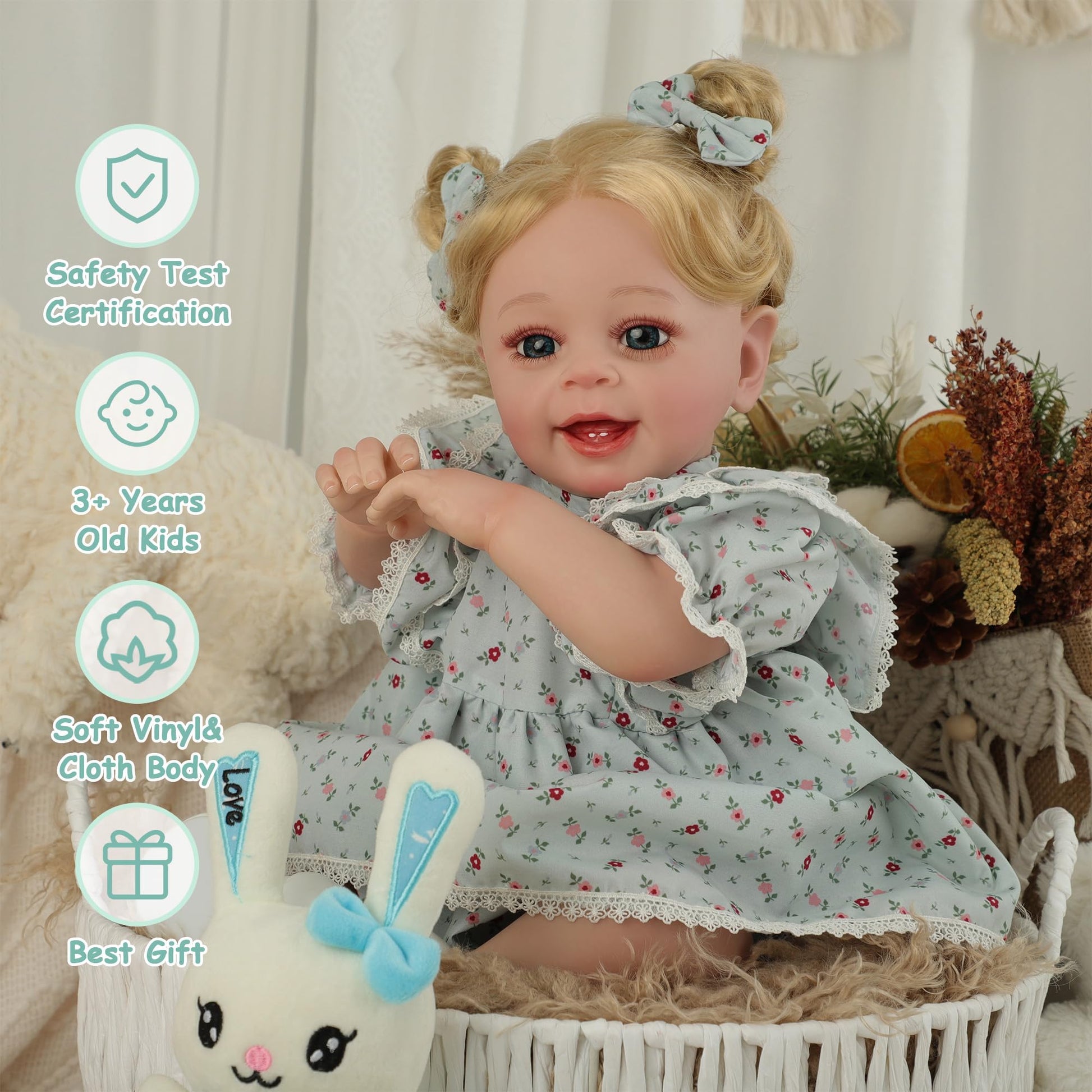 REAL LIFE BABY DOLL: This reborn baby doll is carefully designed with adorable face, hand-rooted bronde curly hair for styling, cloth body with soft vinyl limbs. Hope this weighted and poseable reborn baby doll will bring you lifelike feel. | HER SIZE: The size of Rebecca is 22'' (55cm) from her head to toe. The weight is 2.5lbs. Clothes for newborn 0-3 months will fit her perfectly. | BEST ACCOMPANY:Kids always need a playmate they can grow up with and this real life like baby doll will provide the purest companionship. Rebecca will help your kids learning how to take responsibility, take care of others, and cultivate close relationships. Also your kids will develop their social and cognitive abilities from an early age. | ?PERFECT GIFT? This realistic baby doll is most definitely a wonderful gift for your kids, grandchildren on birthday, thanksgiving, christmas, etc. | ?TAKE HER HOME?Gift Box Ready: 1 x Realistic Reborn Baby Doll with her Bunny Plush Toy, 1 x Birth Certificate, 1 x Baby Bottle,1 x Magnetic Pacifier, 1 x Diaper, 1 x Clothes Set as pictured in the Gift Box.