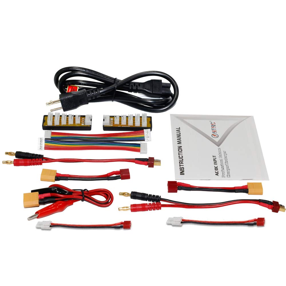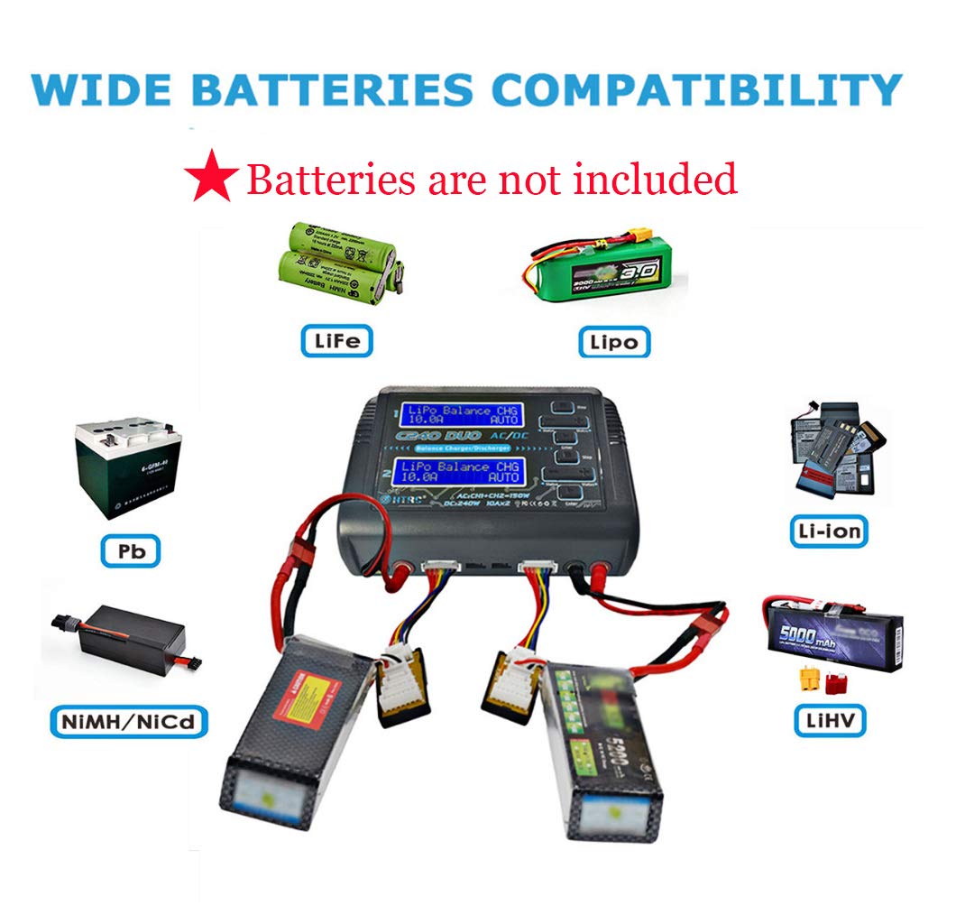Features: *Twin-channel,charge two different kinds of batteries simultaneously. *Automatic identification of Li-Po batteries cells counts *Multiple charging modes. -Lipo/Lilo/LiFe/LiHv: balance charge, charge, fast charge,storage, discharge. -NiMH/NiCd: Charge, Discharge, Cycle. -PB: Charge,Discharge,Trickle. *Multi-extra function: -Battery Meter:Display lithium battery cell counts, total voltage, battery capacity percentage,each cell's voltage. (does not support 1s battery) -TVC(Terminal voltage control):The Charger allows user to set the charge/discharge end voltage. -Lithium Battery internal Resistance Check: can display each cell's resistance.(does not support 1s battery) -Balancer: individual-cell-voltage balancing,cell voltage Monitoring -Smart battery:Smart battery I,II,III,and Digital DC Power.(Need optional DJI Charging cable) Specification: Model No:HT-0098 Input: AC 100-240V / DC 11-18V Charge power: AC mode 150W (CH1+CH2=150Watt),DC mode 120W*2 =240W Discharge power:10W*2 Charge current range:0.1-10A *2 Discharge current range:0.1-2A*2 Lilon/LiPo/LiFe/LiHV cell count :1-6cells*2 NiCd/NiMH battery cell count:1-15cells*2 PB Battery voltage:2-20V*2 Smart battery:I/II/III*2 Current drain for balancing: 500mA/cell Net Weight:0.48kg Dimension:145*105*64mm Gross weight:0.9kg Package size:215*155*75mm Package list: 1x HTRC C240 Dual Lipo Balance Charger 1x AC Cord 1x DC Cord 1x User's Manual 2x Charge cable banana plug to T-Plug 2x Extension charge cable T-Plug to XT60 2x balance board with pin cord
