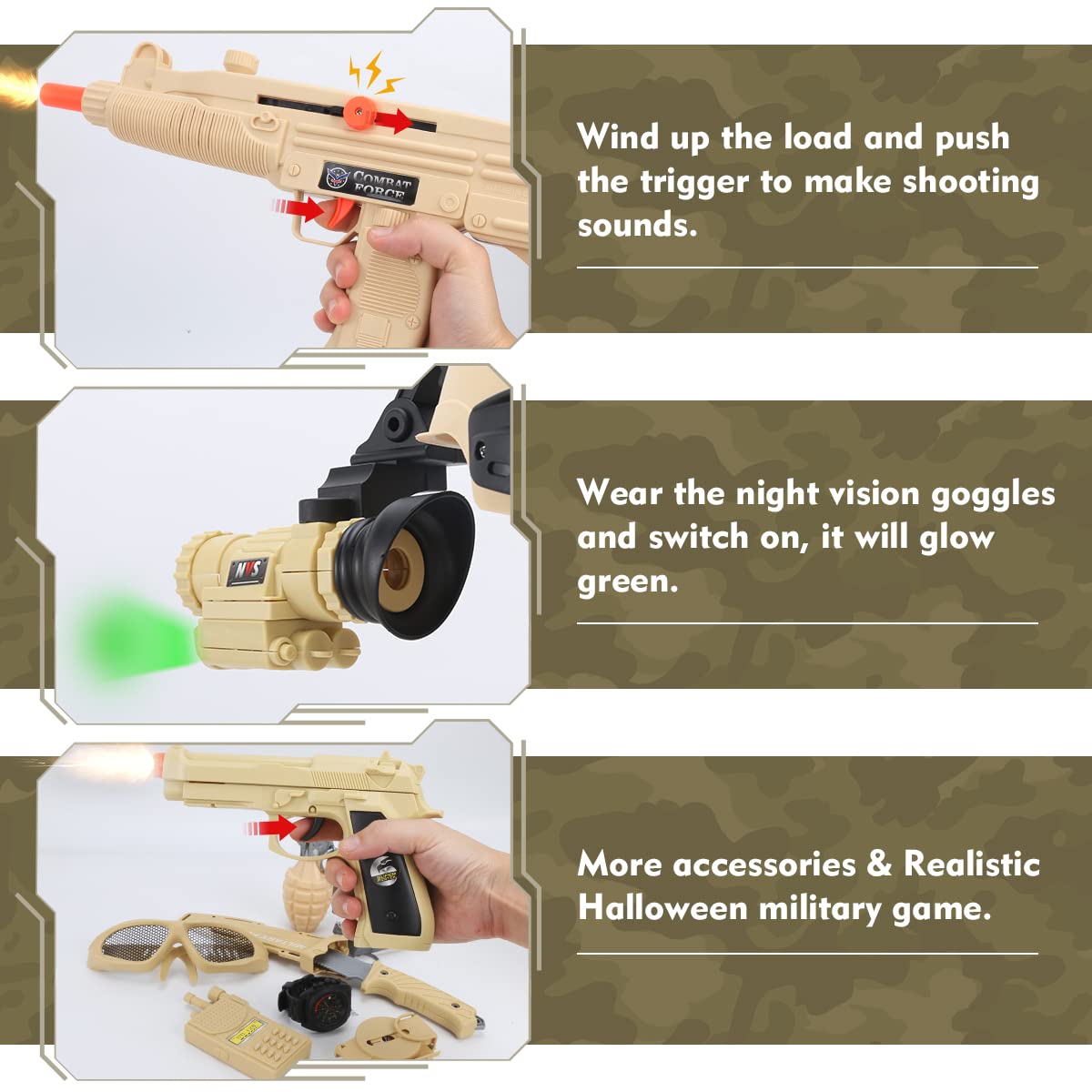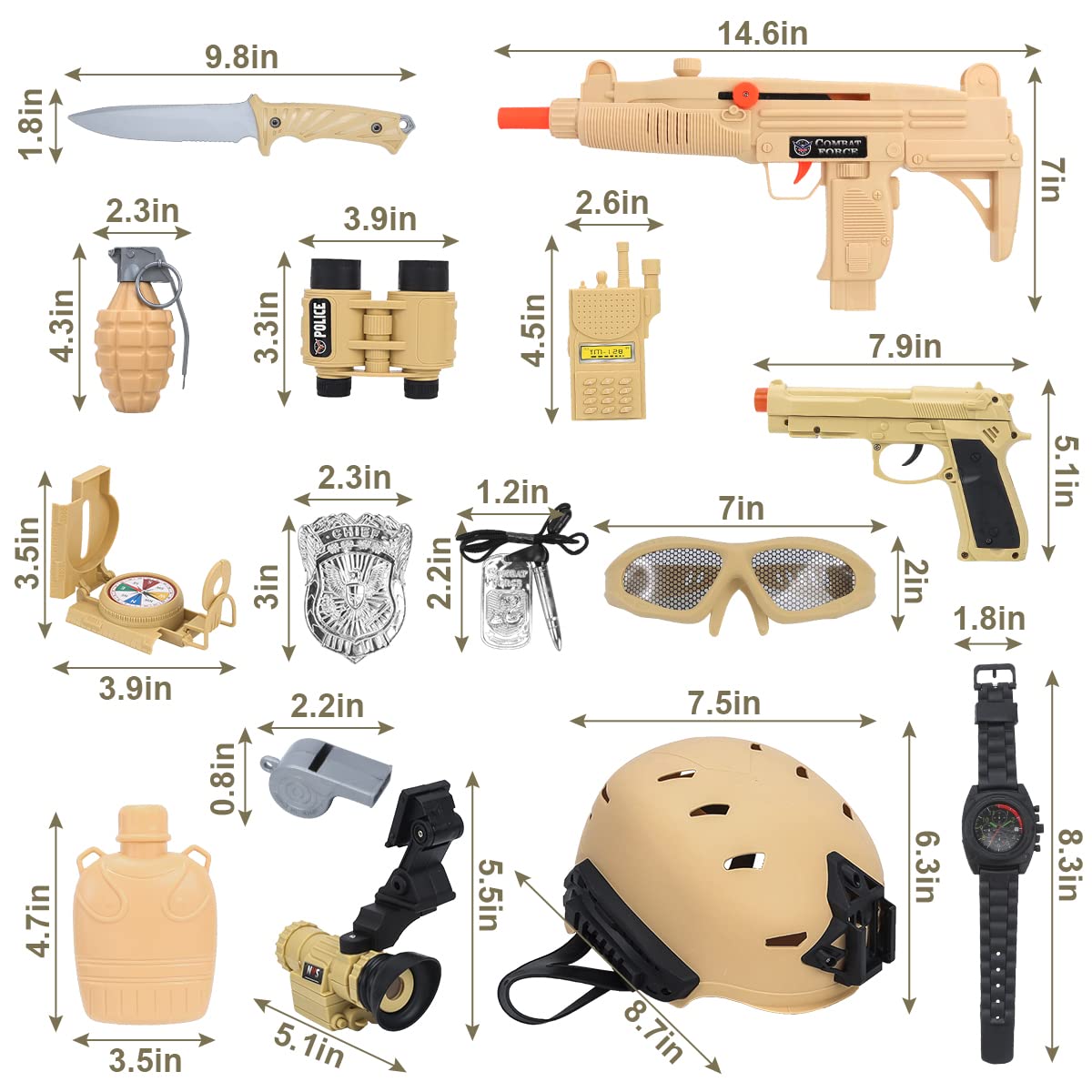 - Q: What accessories are included with the army costume? A: This 17-piece army costume set includes a camouflage vest, helmet, night vision goggles, binoculars, compass, water bottle, walkie-talkie, whistle, nameplate, pendant, dagger, watch, and two toy grenades, as well as a pistol and rifle, providing everything your child needs for an immersive play experience.