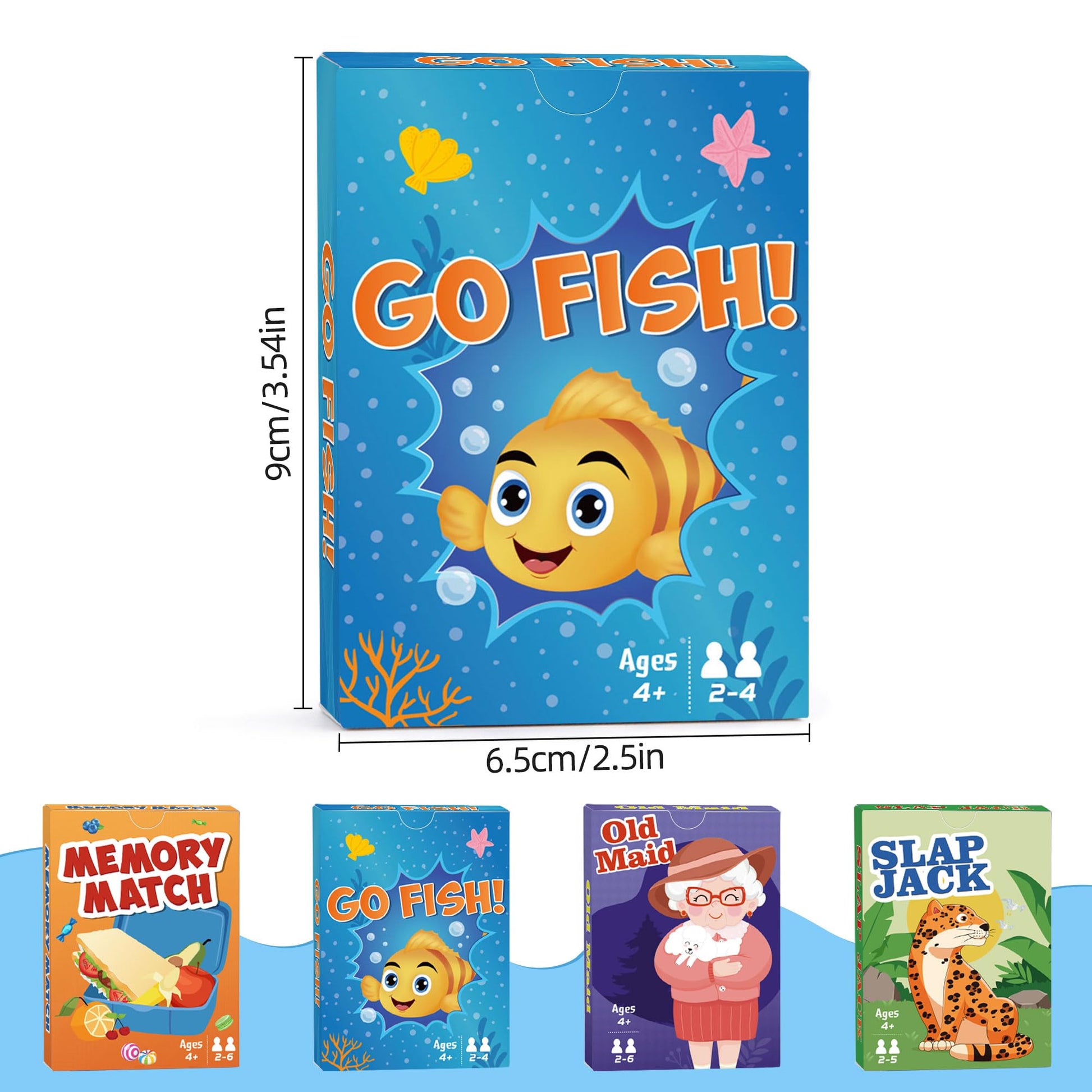 - Q: What classic card games are included in this pack? A: This pack includes four classic card games: Go Fish, Old Maid, Slap Jack, and Memory Match, making it a versatile choice for family game nights.