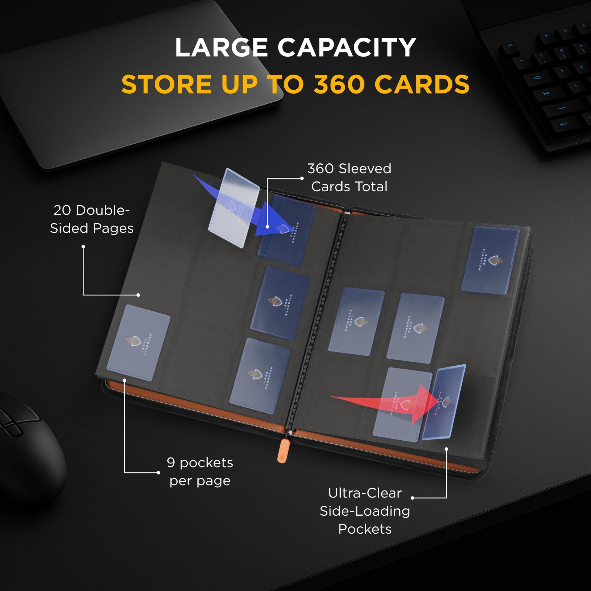 Card Guardian - 9 Pocket enhanced Binder with Zipper for 360 Cards Trading Card Games TCG (Orange) Perfect Card Binder for Yugioh Cards MTG Binder Sports Card Binder