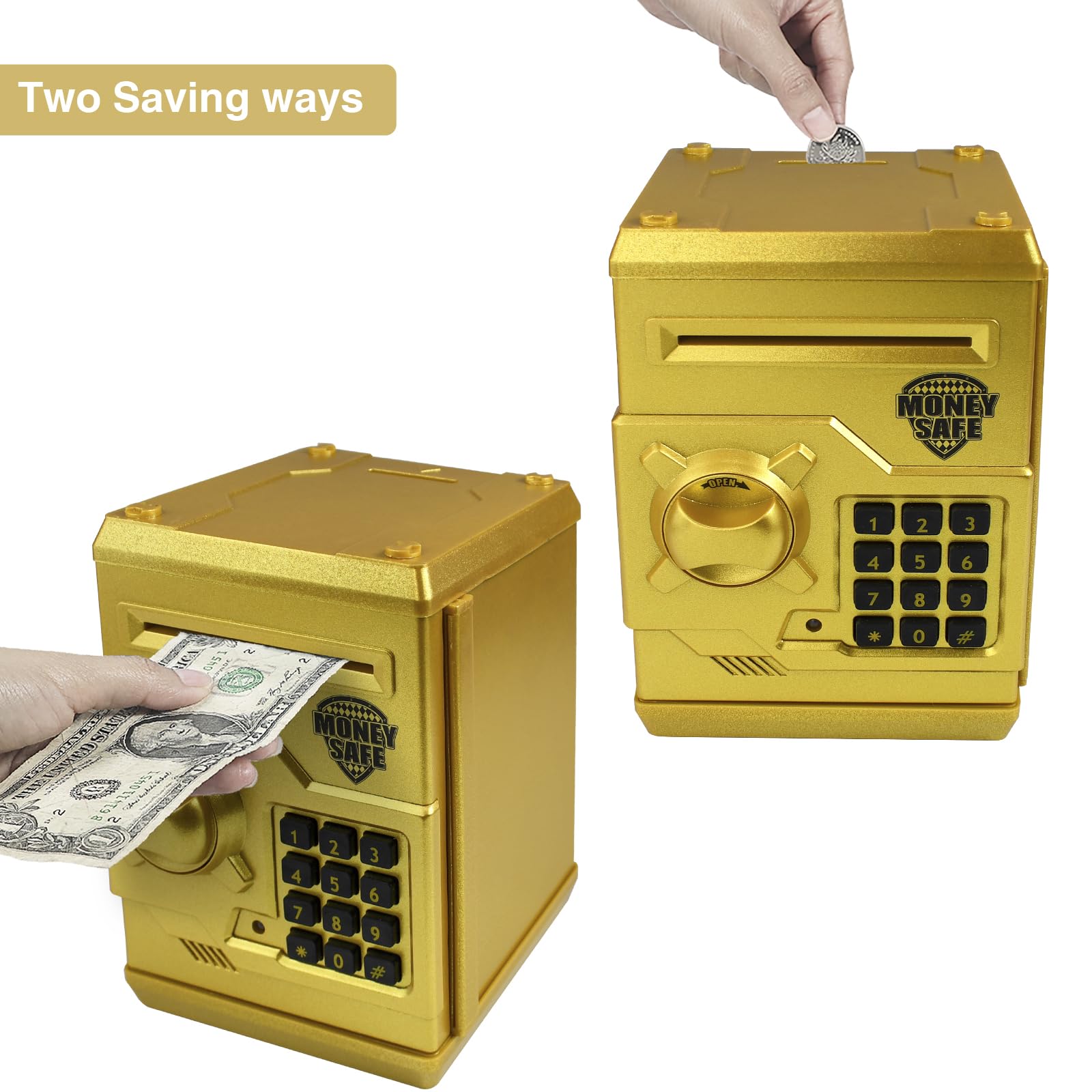 Cargooy Mini Atm Piggy Bank Atm Machine Best Gift For Kids,Electronic Code Piggy Bank Money Counter Safe Box Coin Bank For Boys Girls Password Lock Case (Gold)