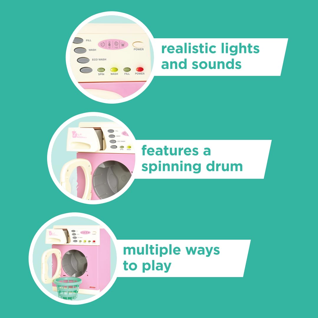 'Whats better than a standard washing machine? A baby pink washing machine, thats what. Put some excitement back into the laundry room with help from this realistic pink washer! Whether your Little Helper is assisting with your pile of laundry or preparing fresh clothes for dolls and teddies, this pink washer has just the ticket. It works just like a normal washing machine would, spinning clothes around in a somewhat mesmerising way. Your little one can choose from two different speeds and take advantage of lights to know when the job is complete. And, lets not forget the sound effects for extra realism! This oh-so energy efficient toy washing machine makes keeping up with the laundry a walk in the park, so much so that your little ones won't ever want to stop! The set even includes a little laundry basket and washing powder to get clothes smelling fresh in no time.''