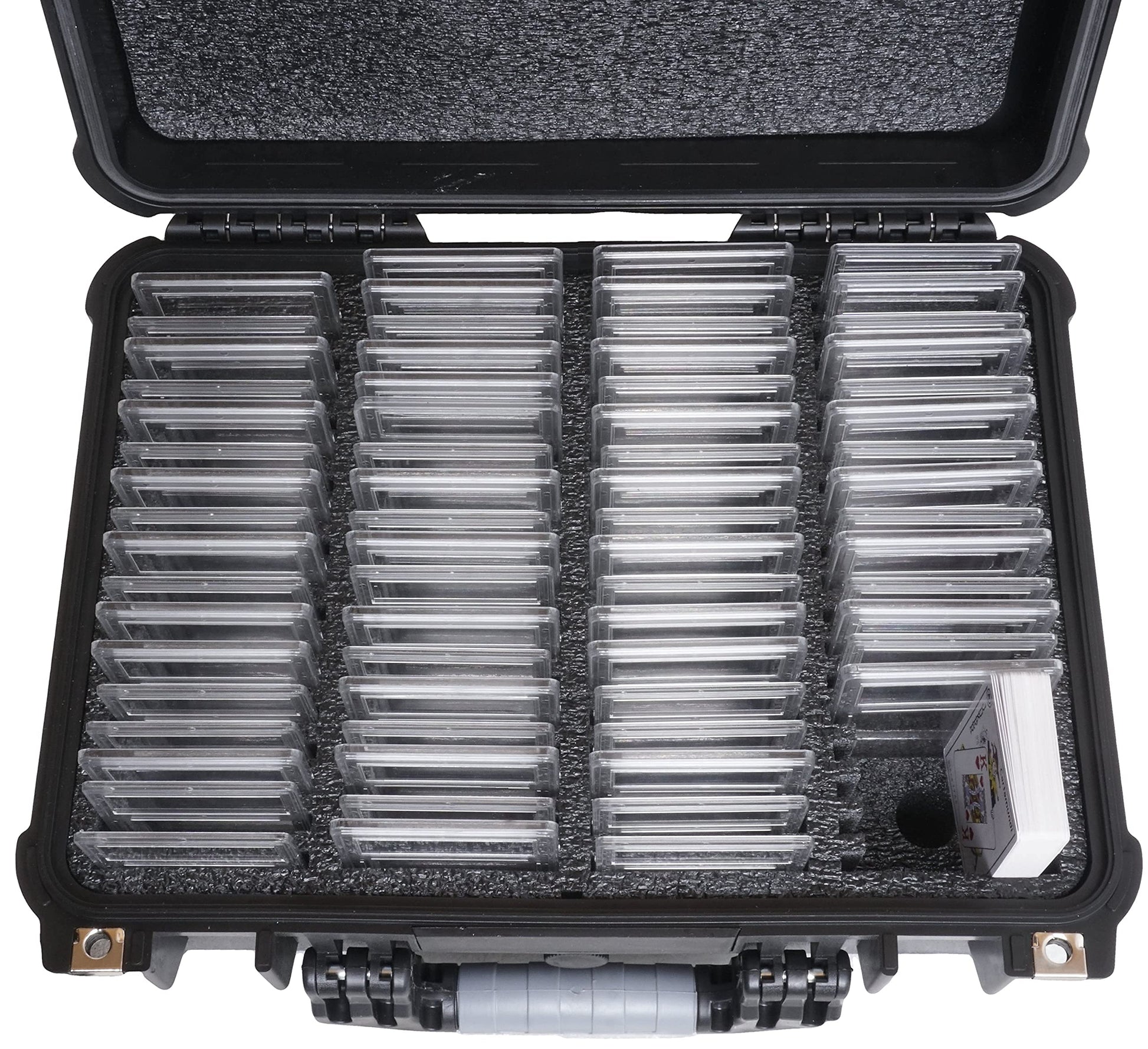 [ Case Fits] 72 Separated Card Slabs (Fits PSA, Beckett, HGA, ISA, GMA), or 132 if the user cuts off the foam separators! Separated slabs ensure they cannot scratch each other. Max Slab Width: 3.25' (double check your widest slab). Also fits One Touch magnetic slabs and Toploader sleeves. | [Case Features] Case Club's rugged graded card travel & storage case is waterproof (IP67), crushproof, dustproof, compact, airtight, shippable, and is TSA approved for checked luggage. The exterior case dimensions are 14.90'L x 12.10'W x 9.60'H. This durable, heavy duty, collector card storage case for sports, baseball, Pokemon, MTG is the most versatile trading card holder on the market. | [Custom Foam Interior] The shock absorbing foam is a military grade closed cell polyethylene that will last a lifetime, and is PRE-CUT to perfectly fit graded card slabs. Protect your Pokemon & sports trading cards while keeping everything well organized for storage, travel & shipping. The pre-cut custom foam fits your slabs out of the box! No messy, irreversible, time consuming plucking required! | [Case Hardware] Shell is made of injection molded high strength copolymer polypropylene plastic with ribs for additional structural reinforcement. 2 strong latches keep the case securely closed; 2 metal reinforced padlock holes keep your contents protected; stainless steel hinge pins for added strength; pressure relief valve for changing altitudes; rubber over-molded handle for comfort; and a gasket seal keeps out water, dust, dirt and other foreign debris. | [The Perfect Gift] Great gift idea for on-the-go collectors, friends, family, travelers and most importantly...yourself!