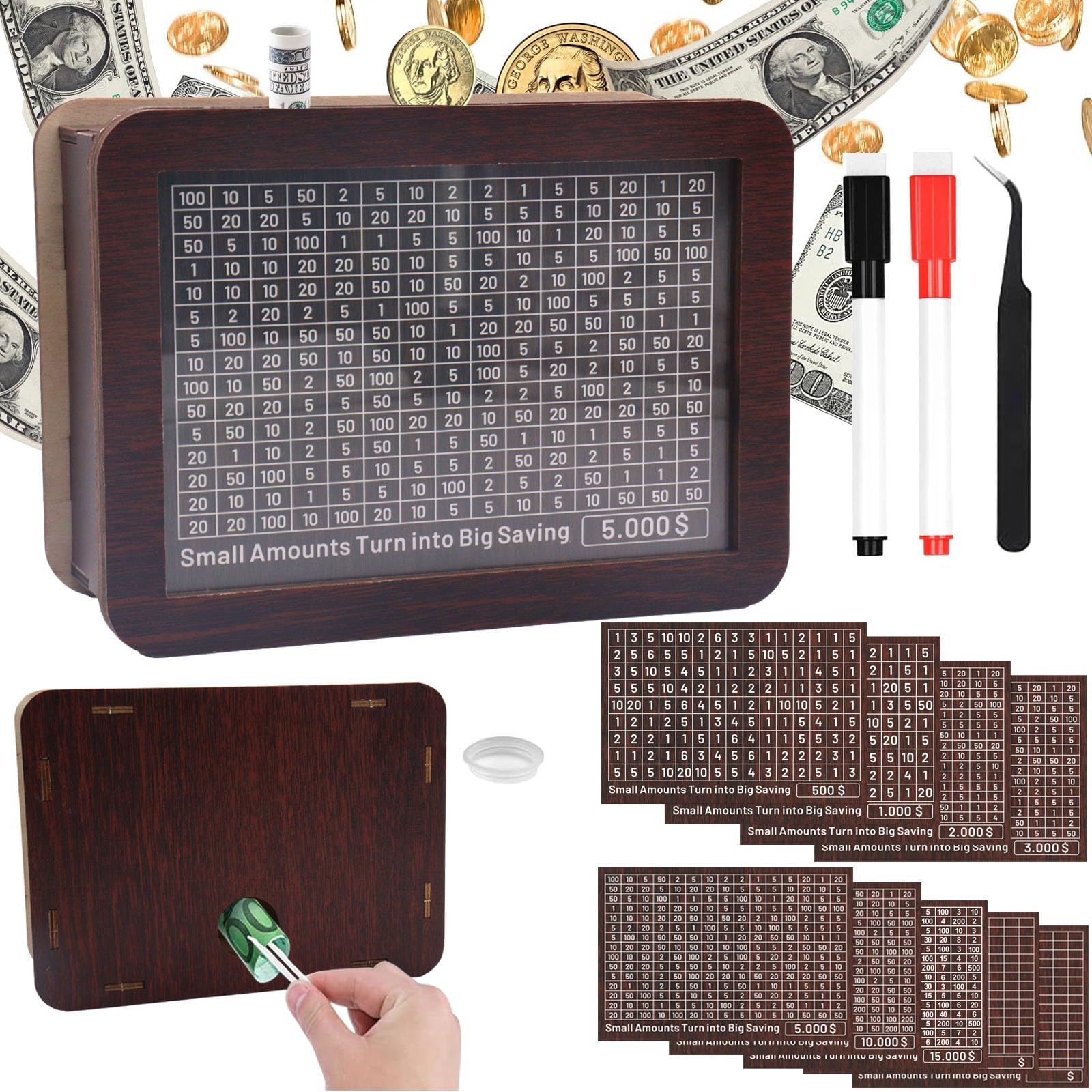 Cash Vault Wooden Savings Box 10000 5000 15000 3000 2000 1000 500 Cash Box With 2 Blank Savings Tracker, Official Save Box(Creat