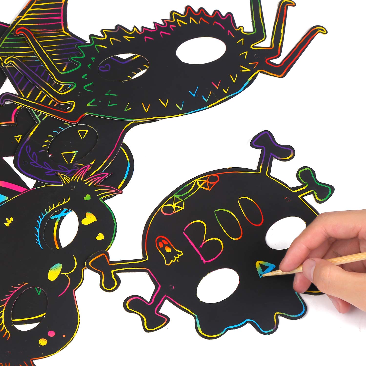 • Q: How do you reveal the colors on the scratch paper masks? A: The vibrant colors on the masks are hidden under a black-coated film, which can be revealed easily by scratching with the included wooden stylus, allowing for creative and magical designs.