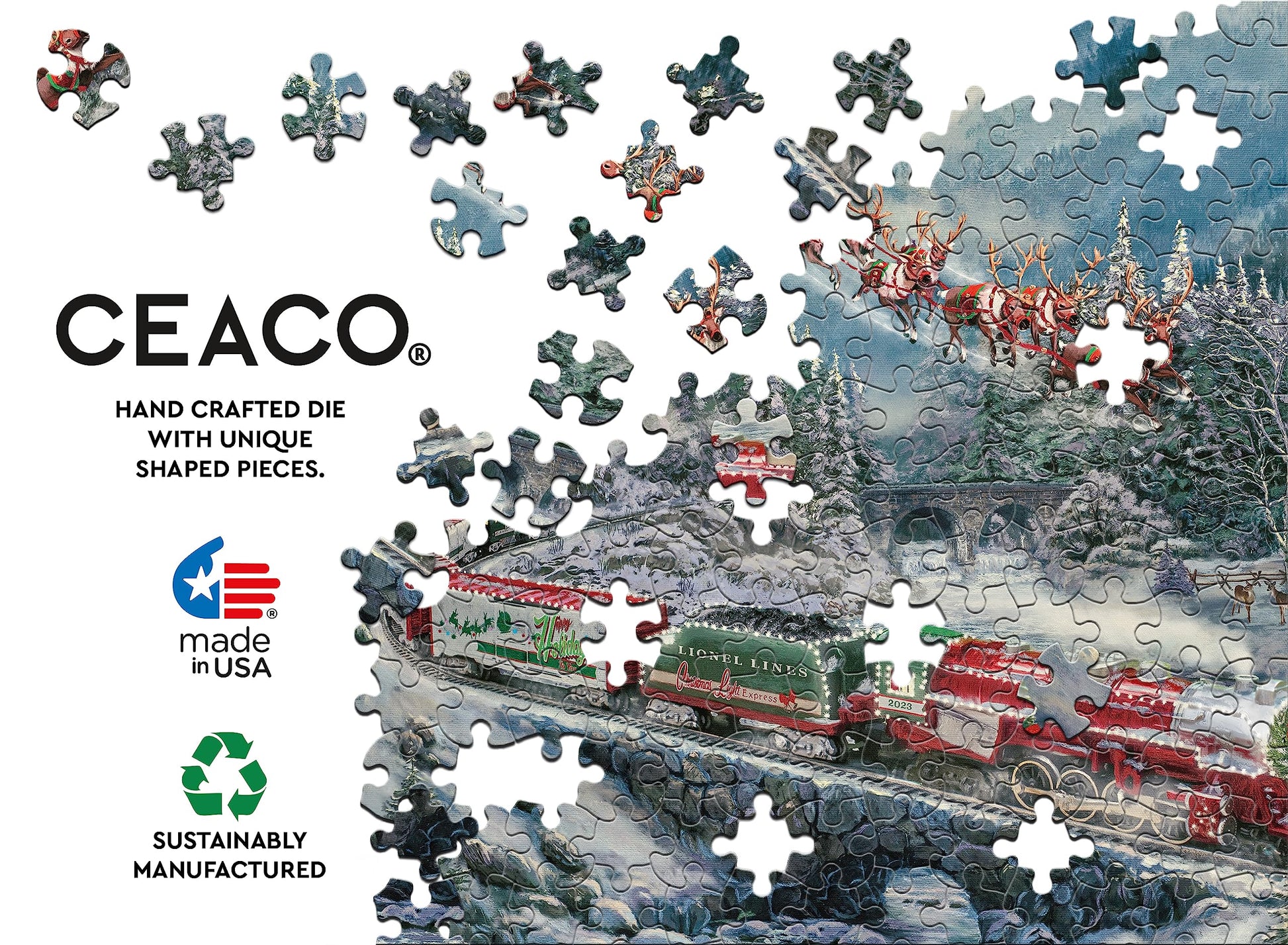 Product DescriptionWelcome to Ceaco! We are so grateful that you have found your fit here. Since our start in 1987 we have remained true to our mission: to create high quality, innovative and challenging jigsaw puzzles and to provide hours of family fun. We pride ourselves on developing and maintaining long standing relationships with some of the finest artists of our time. Our talented team of designers and marketing professionals are always searching the world over for developing trends, emerging artwork, and new technologies involving printing, die cutting, and unique puzzle materials. Our purpose is clear: to continue to be in the forefront of our industry and create a product that combines family entertainment with a distinctive aesthetic. Count on Ceaco for the most creative, exciting, and colorful products ever! Thanks and happy puzzling!From the ManufacturerThis Tis the Season 550 Piece puzzle features Santa's Train. It measures 24 inches x 18 inches when completed. It is proudly made in the USA.