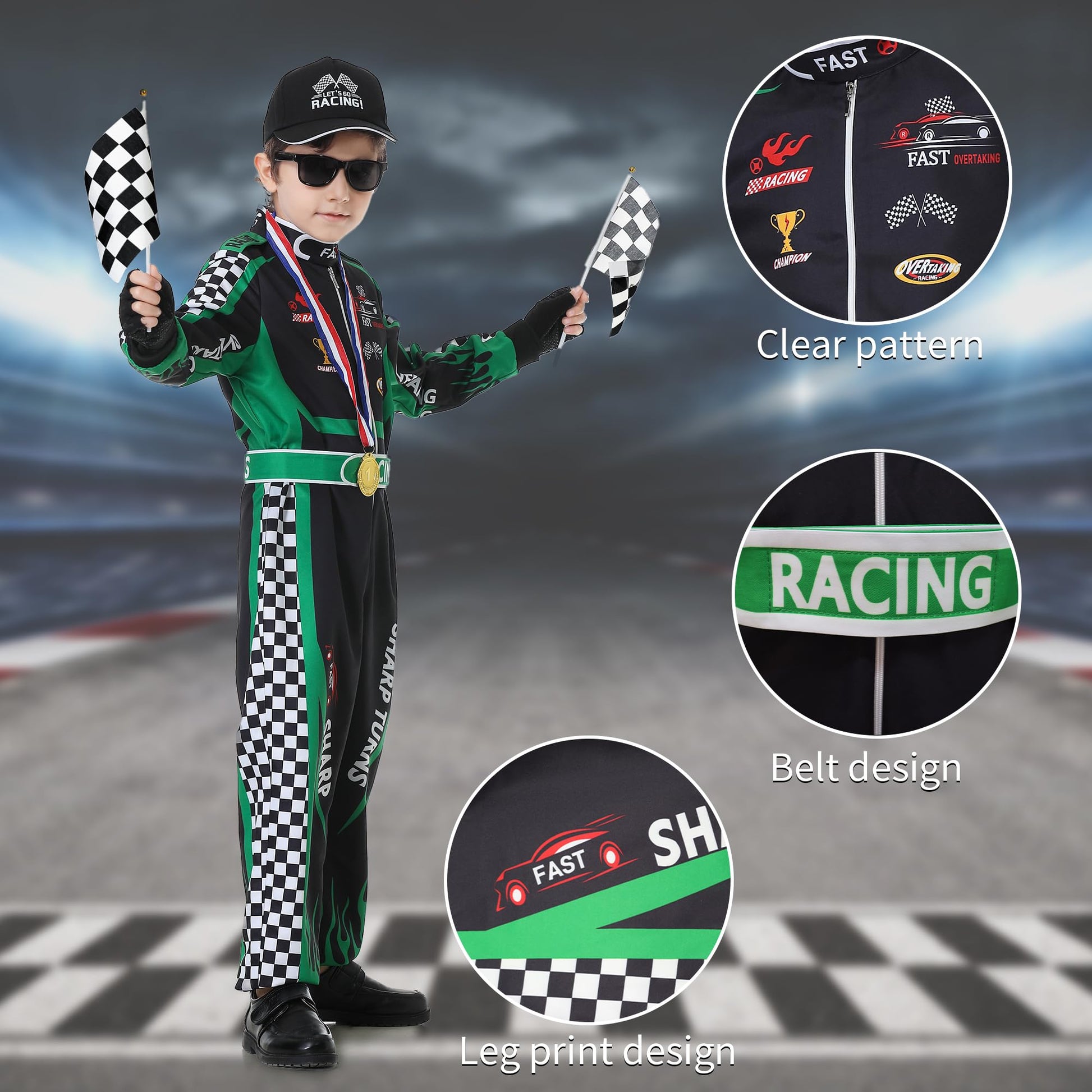 Changchupsem 6PCS Race Car Driver Costume Boys Racing Suit Kids Jumpsuit Set with Cap Medals Glasses Gloves for Halloween
