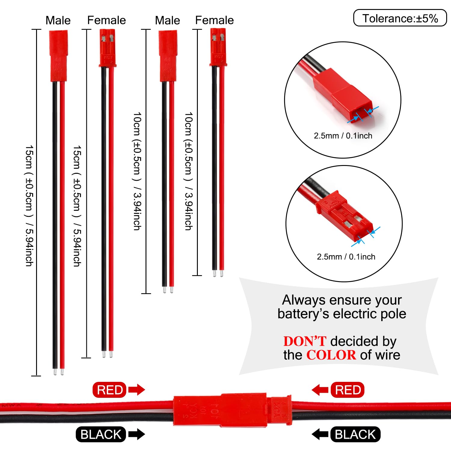 ?Product information?-- 15 Paris Jst SYP2.54mm Pitch 2Pin Male Plug and Female Socket Jack connector 20 Awg 10cm (3.97inch) and 15cm (5.9cm) UL 1007 Entire Tinned Copper Wire Cable Can Be Inputed 5A & 300V | ?Quality Advantages?-- The Entire Tinned Coating Copper Wire Can Easily to Solder on other objects after is Cut Anywhere | ?Quality Advantages?-- UL1007 Wire More Durable and Secure for Daily Use, Robust Fastening Give the Solid Connection | ?Application object?-- Remote Controlled Vehicles and Tiny Drone Battery, Other Toys Battery, Etc | ?Usage Tips?-- The Wire Color Should Not Be Used to Determine Electric Poles, Always Double Check Battery's ''+'' ''-''