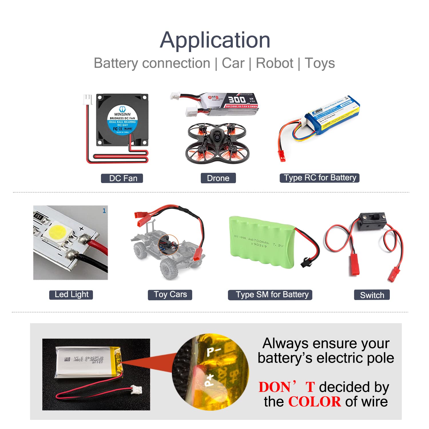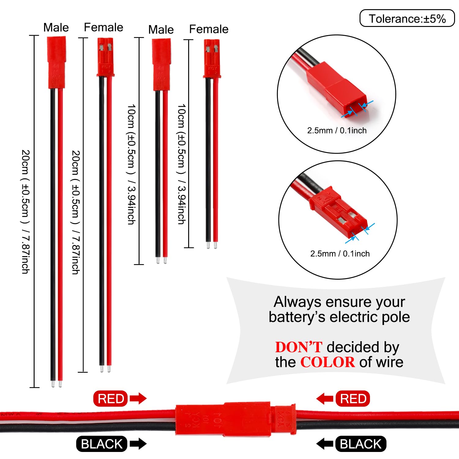 ?Product information?-- 15 Paris Jst SYP2.54mm Pitch 2Pin Male Plug and Female Socket Jack connector 20 Awg 10cm (3.97inch) and 20cm (7.87inch) UL 1007 Entire Tinned Copper Wire Cable Can Be Inputed 5A & 300V | ?Quality Advantages?-- The Entire Tinned Coating Copper Wire Can Easily to Solder on other objects after is Cut Anywhere | ?Quality Advantages?-- UL1007 Wire More Durable and Secure for Daily Use, Robust Fastening Give the Solid Connection | ?Application object?-- Remote Controlled Vehicles and Tiny Drone Battery, Other Toys Battery, Etc | ?Usage Tips?-- The Wire Color Should Not Be Used to Determine Electric Poles, Always Double Check Battery's ''+'' ''-''