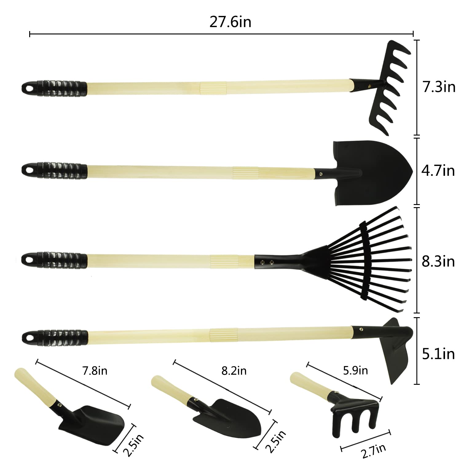Cheerbank 7Pcs Kids Gardening Tools, Long Shovel, Rake For Leaves, Spade, Hoe, Steel Heads & Real Wood Handle, Yard Tools For Ch