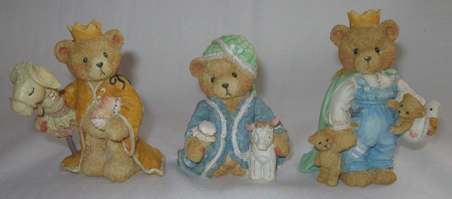• Q: What are the dimensions and weight of the Cherished Teddies Three Kings figurines? A: The Cherished Teddies Three Kings figurines do not have specified dimensions or weight listed, as they are designed to be collectible figurines without specific item sizes.