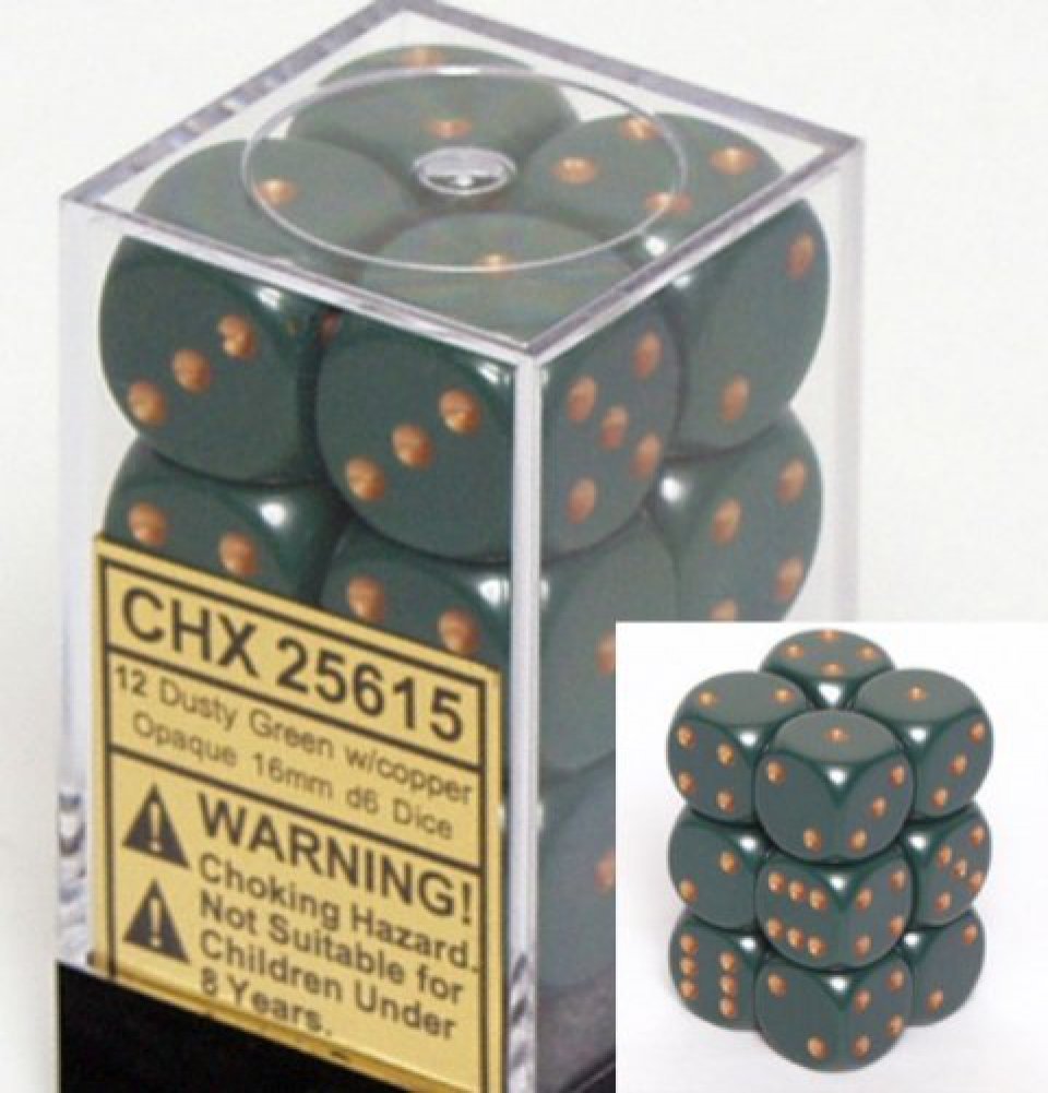 CHX25615 Dusty Green 16mm D6 Opaque Dice Block of 12 12ea - 16mm D6 Dice in plastic container