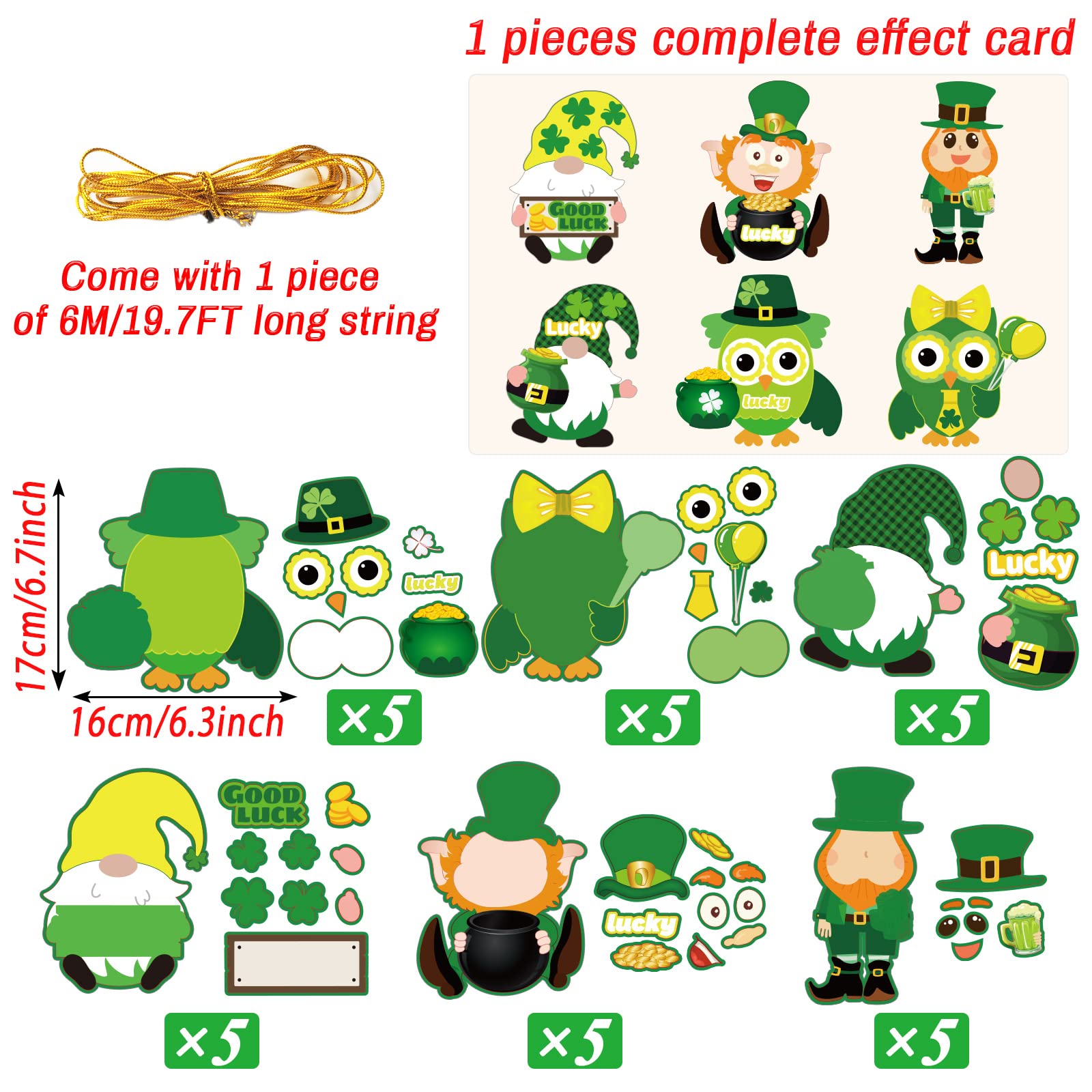 • Q: What materials are included in the St. Patrick's Day craft kit? A: The kit includes 30 body cards featuring 6 different patterns, 15 sticker sheets with over 230 stickers, and a 6M/19.6FT string for hanging the finished crafts.