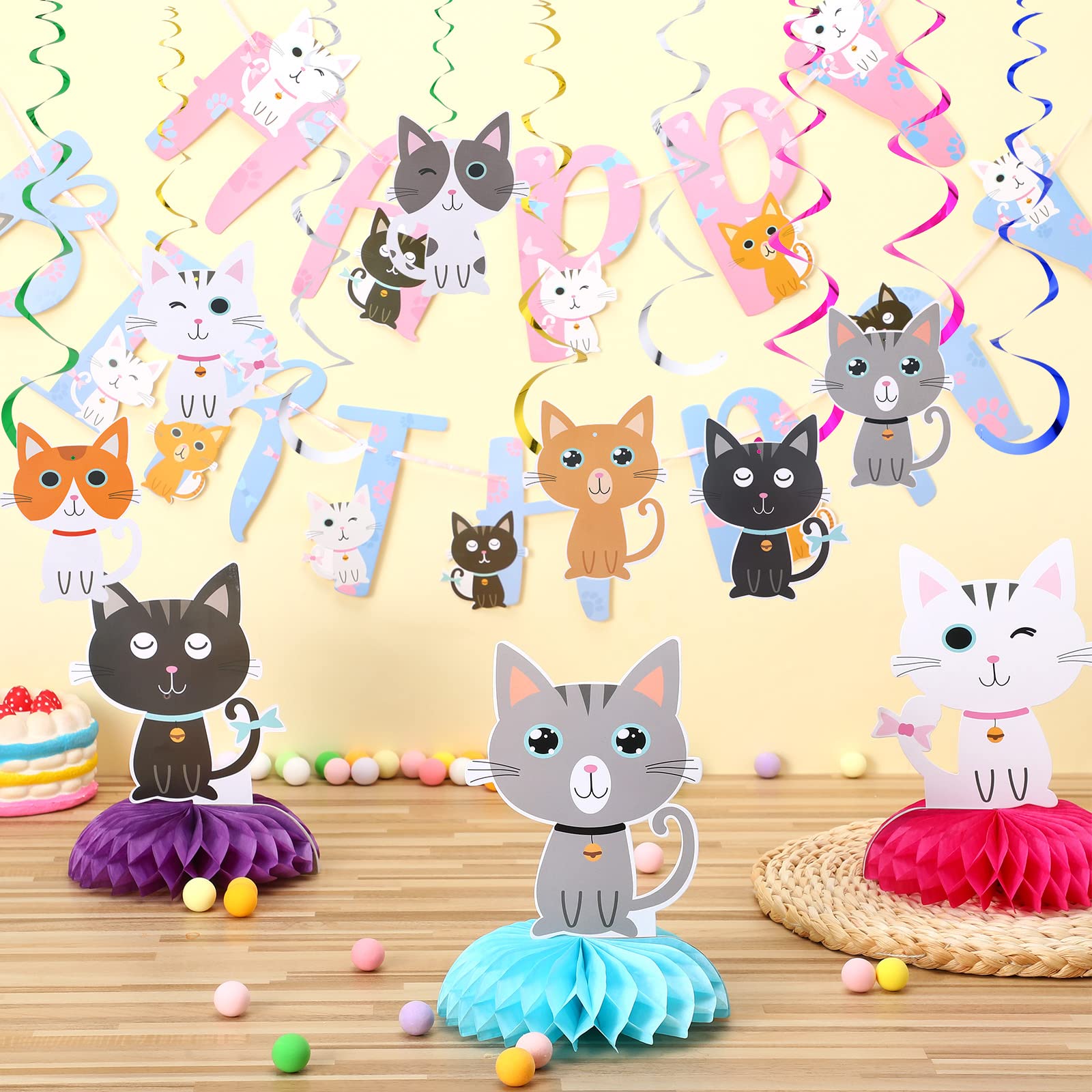 Chinco 16 Pcs Cat Theme Birthday Party Decorations Party Supplies Kit, Includes Cat Party Banner With 6 Hanging Cutouts 6 Hanging Swirl Decor And 3 Birthday Honeycomb Party Decoration(Cool Style)
