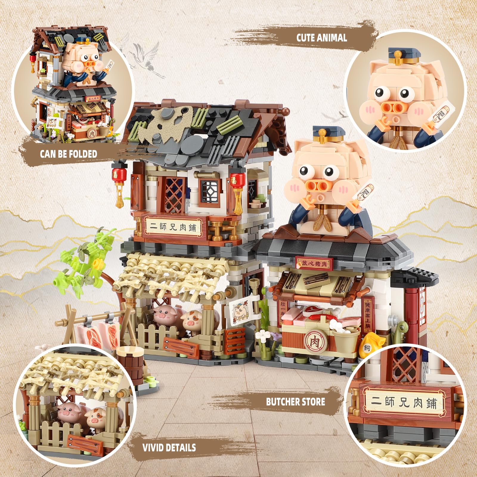 Chinese Street View Butcher Shop Mini Building Blocks, Moc Creative Building Toys Model Set For Girls 6-12 Years Old, 1105 Pcs S