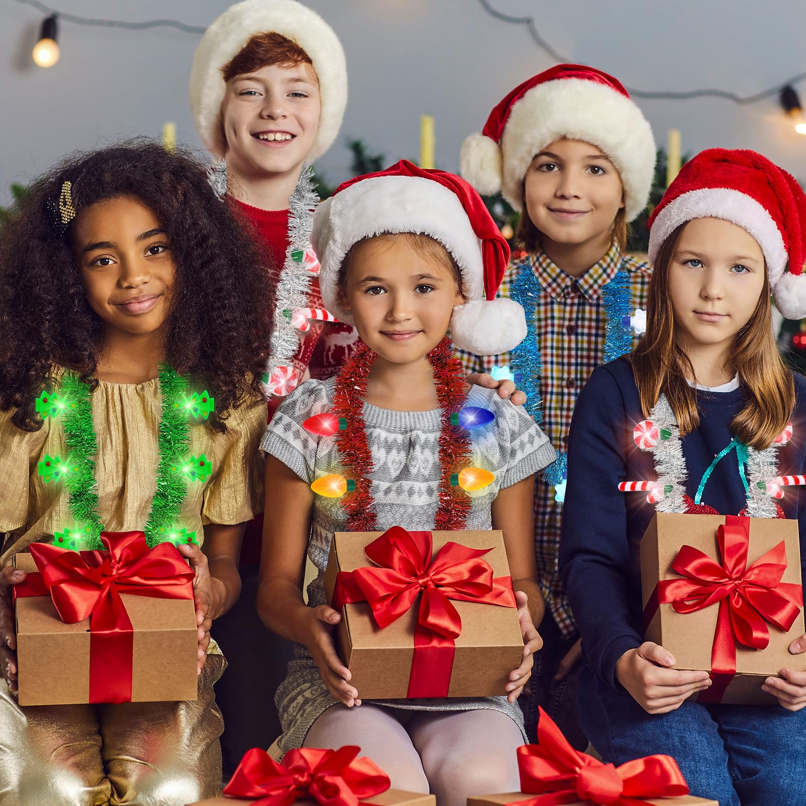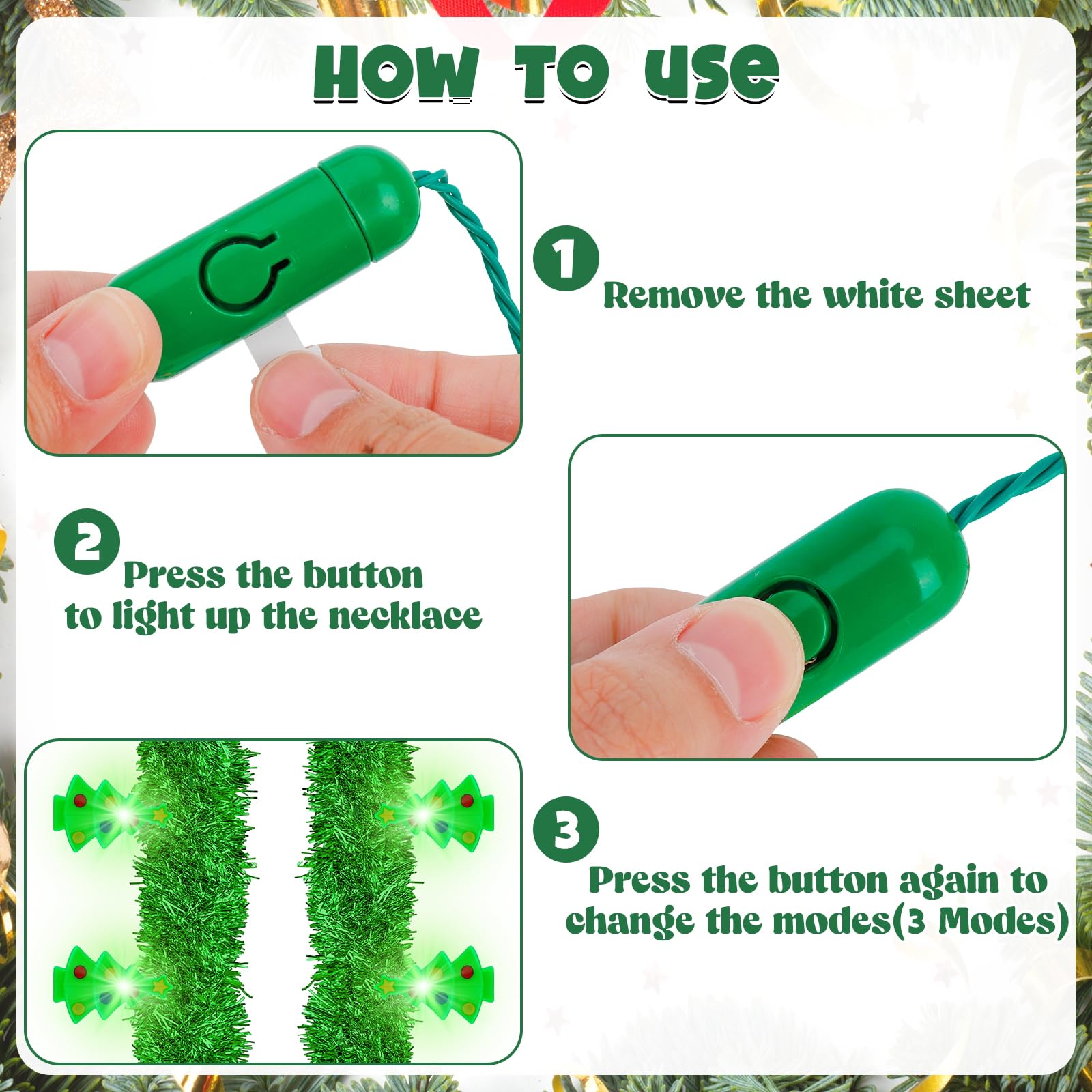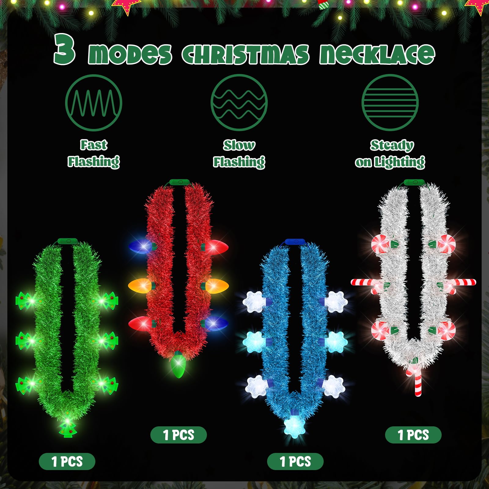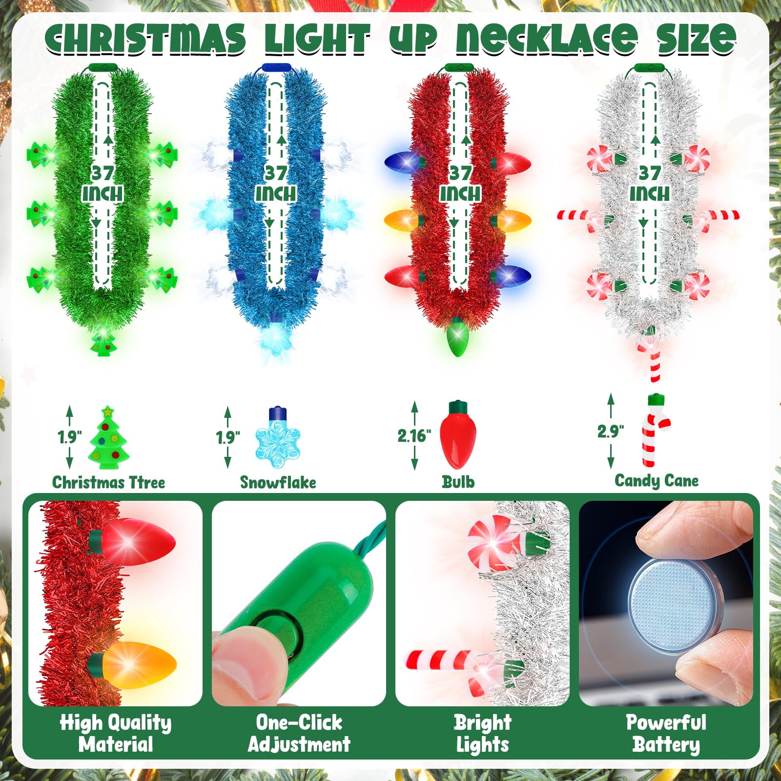 Illuminate Your Celebrations with Our Christmas Glow Necklaces! Our Advantages: The size fits most people Three modes to light up the party Safe copper wire, PVC and LED materials The Christmas necklace features classic elements Package Includes: 4 pcs light up Christmas necklaces Specifications: Necklace size: 37 In Snowflake: 1.9 In Xmas bulb: 2.16 In Candy cane: 2.9 In Christmas tree: 1.9 In