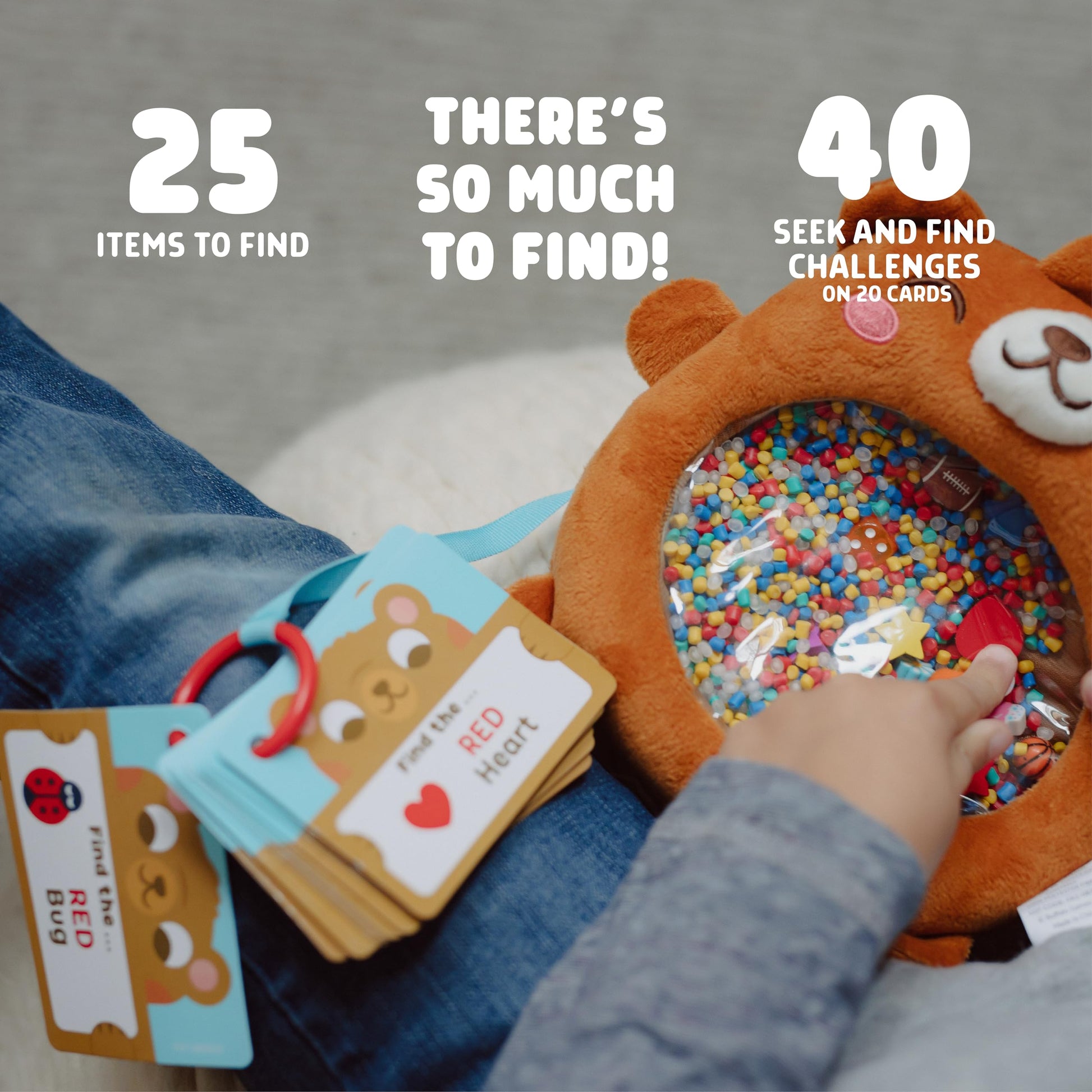 - Q: How many seek and find challenges are included with the bear? A: The bear comes with 40 no-reading-required seek and find challenges spread across 20 cards, allowing children to enjoy hours of self-guided play while enhancing their sensory skills.