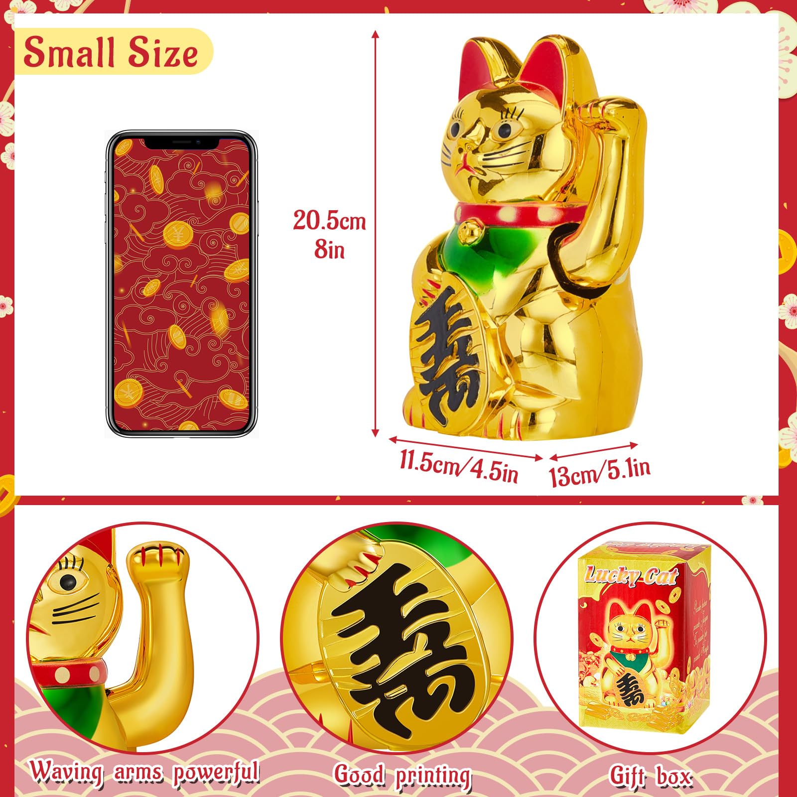Features: Convenient storage: This lucky kitty waving arm will only occupy a small box after being packaged together, proper size won't take up too much space, convenient for your storage so that it can be applied next time. Reliable material: The good luck waving cat is made of sturdy alloy material, well crafted, firm and reliable, with cute cat shape, the cat is not easy to rust, reducing your extra expenditure, the metal material will serve you for a long time. Specifications: Material: alloy Color: as the pictures shownSize: about 20.5 x 13 x 11.5 cm/8 x 5.1 x 4.5 inchesPackage includes: 1 x Good luck waving catNotes: Manual measurement, please allow slight errors on size. The color may exist a slight difference due to different screen displays. Battery cover is not included.