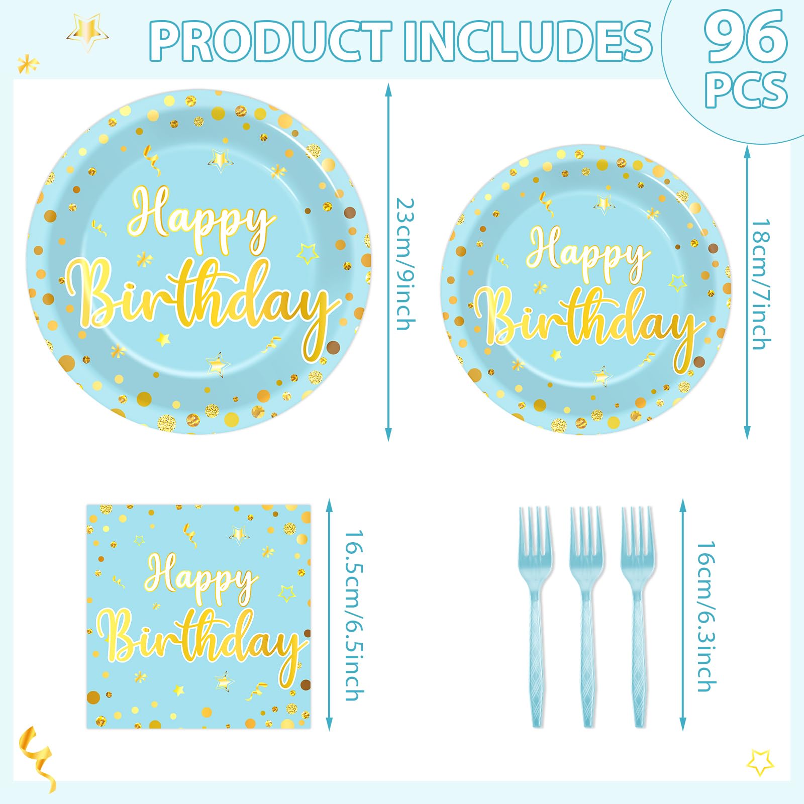 CHUNNIN 96PCS Blue Birthday Plates and Napkins Birthday Party Decorations Light Blue and Gold Dessert Plates Tableware for 24 Gu
