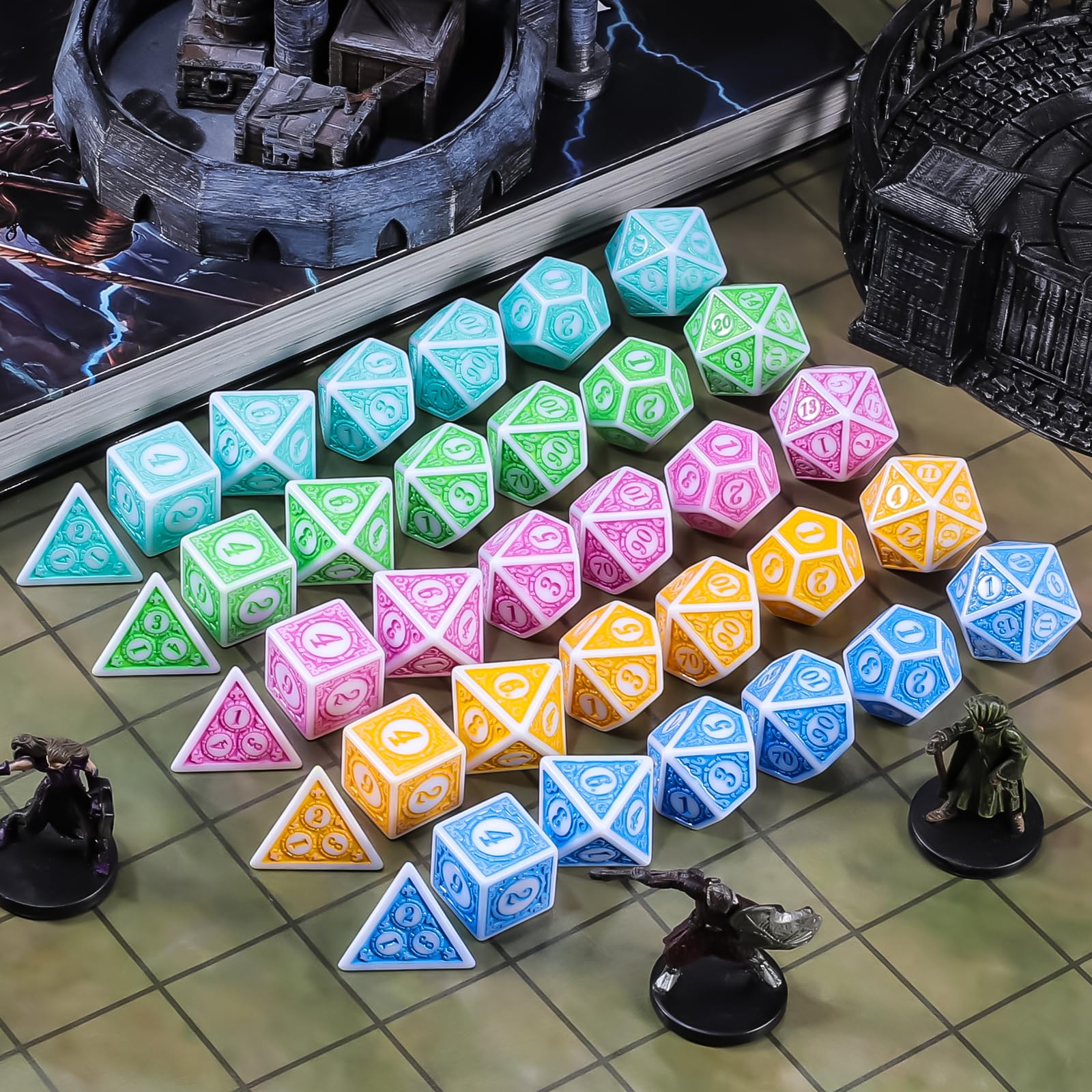 - Q: How many dice are included in the CiaraQ DND Dice set? A: The set includes a total of 35 pieces, comprising 5 sets of polyhedral dice, with each set containing 7 dice: D4, D6, D8, D10, D%, D12, and D20.