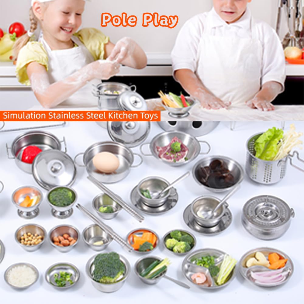FIRST, QUALITY: Pots are made of durable and thick hand-polished stainless steel, handles and knobs feature sturdy riveted joints. Play food and accessories are made of non-toxic ABS plastic. All toy pieces are designed for secure and long-lasting play! 25 ITEMS REALISTIC KITCHEN PLAYSET: The KID-SIZED play set includes: stainless steel pots and pans w/ lid and handles, colander, pot rack; utensil holder contains 5 stainless steel cooking tools PLAY FOOD W/ STORAGE BASKET: giving a realistic chopping experience! A cute basket is added for storing and inspiring more ways of playing! EDUCATIONAL TOYS: A great learning tool for role play and to help increasing fine motor skills, life skills and social skills, minimize screen times and to enhance parent-child interaction. SUPER VALUE TOY : Ages 3+; Pot rack measures 12. 8'' H x 7'' W x 5. 7'' D (refer to Photo). A great addition to play kitchens and pretend play food-themed products. Generously sized toyset for birthday party, Christmas, New Year and more. FULL BUT NO MESS! FEEL LIKE REAL PROS! Especially sized for kids Pots can put neatly on a convenient rack after playtime, which forms a good habit of storage. Rich kitchen accessories from cutting, cooking, serving and storaging. Prefectly coordinates with any play kitchens, suitable for playhouse, outdoor kitchens, group play. Promotes self-confidence, social and cognitive skills, resilience and more.