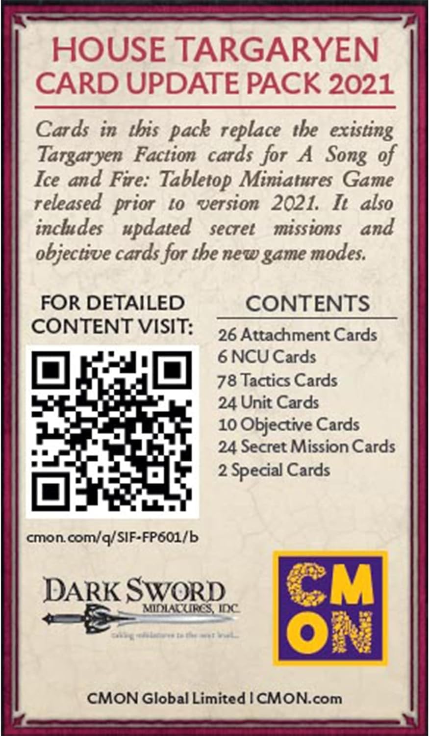 • Q: What is included in the Targaryen Faction Pack for A Song of Ice and Fire? A: The Targaryen Faction Pack includes updated cards for tournament play, revamped secret mission and objective cards for new game modes, and figures that are pre-colored and fully assembled, ready to use in gameplay.