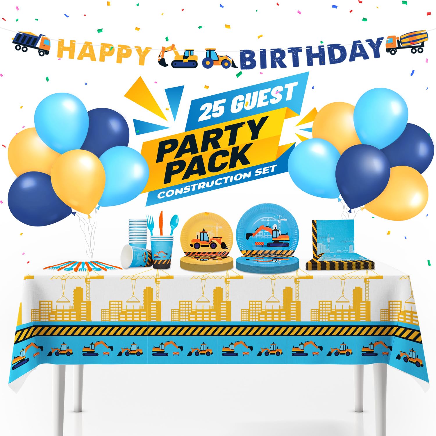 - Q: What items are included in the Construction Birthday Party Supplies Set? A: The Construction Birthday Party Supplies Set includes 25 dinner and dessert plates, cups, utensils, napkins, a tablecloth measuring 54x104 inches, and a banner, providing everything you need for an exciting construction-themed birthday celebration.