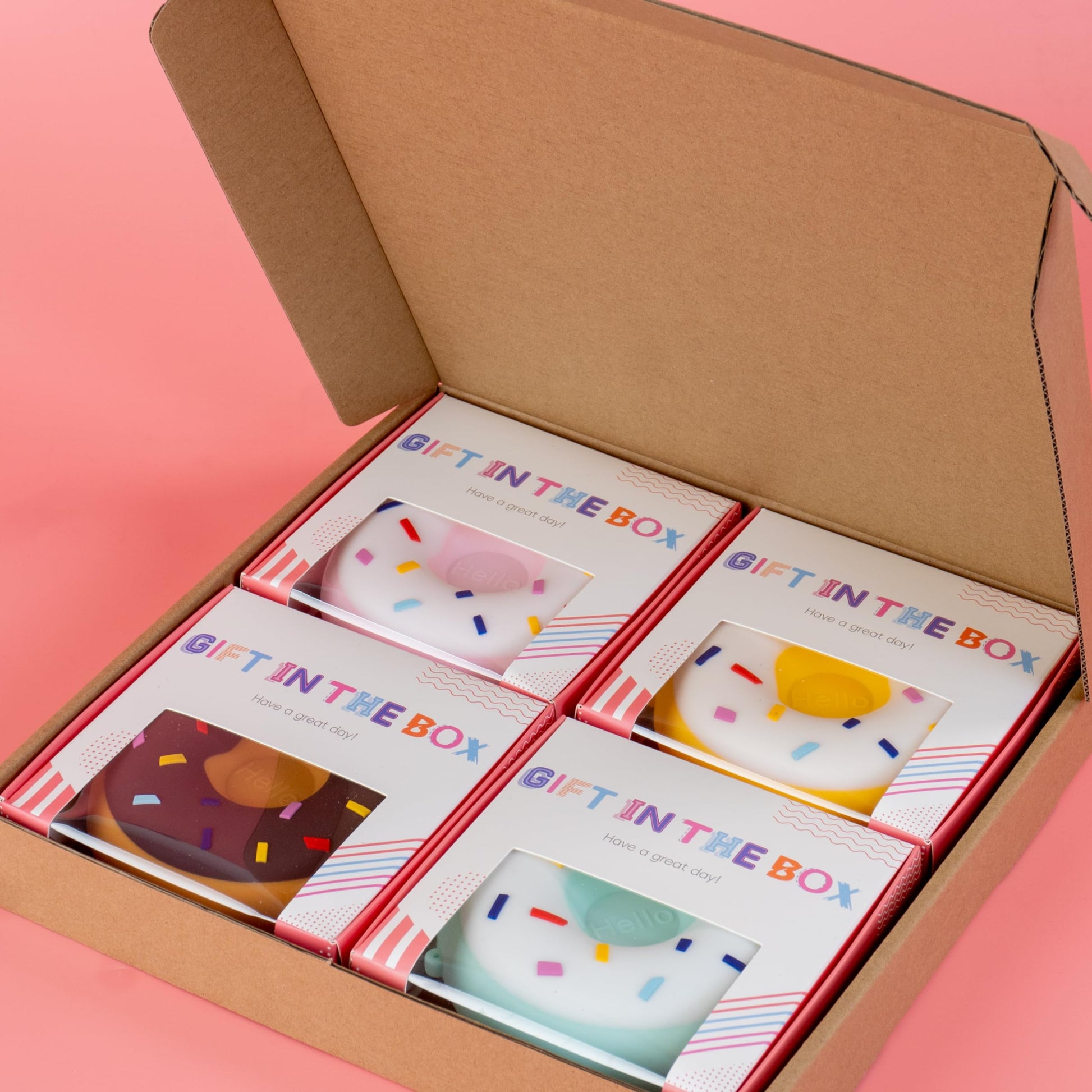 This is a set of 4 donuts purses in a mix of color strawberry pink, lemon yellow, mint green and chocolate brown intended for little girls age 3 to 6. The purses are a cute toy, can be used as a gift and in many different games, that kids like to play. Little girls for example like to pretend play that they have makeup inside or pocket money, going out or to a shop. Also girlie treasures like plastic jewlery, finger rings, necklaces, earrings or hair brushes can be put inside. If you take the kids on a trip, they can bring their own snacks and sweets and keep them safe. The little bag looks just as cute and sweet as a real donut. It goes well with chocolates or peanut treats fillers or giving out valentines in bulk during easter, christmas or birthday. It is made from silicone, giving it a good feeling while keeping the donut robust and a perfect accessoire for children to play with. It can also be easily cleaned, water, dust, sand, mudd, forming clay and so on are usually no problem for this type of material. The 4 donut bags are each individually packed in one gift box. They come in a bigger box, that can be taken to a party like a donut delivery or serve as a display to showcase the little handbags. Each unit of the purses comes in at 3.88 oz and 4.7 in in diameter. They are small and light for usage of children. A zipper is used for closing. A should strap is attached to the bag body. The strap can also be removed, as well as be adjusted in length. As the kids grow, the should strap can be adjusted to make for comfortable wearing and allowing for longer term use of the toy. Other colors, themes and variations of little toy purses are available from CONTRACONTACT. Thank you very much for your interest and purchase of the sweet kids purses, they surely will bring big smiles, happiness and laughter to the kids.