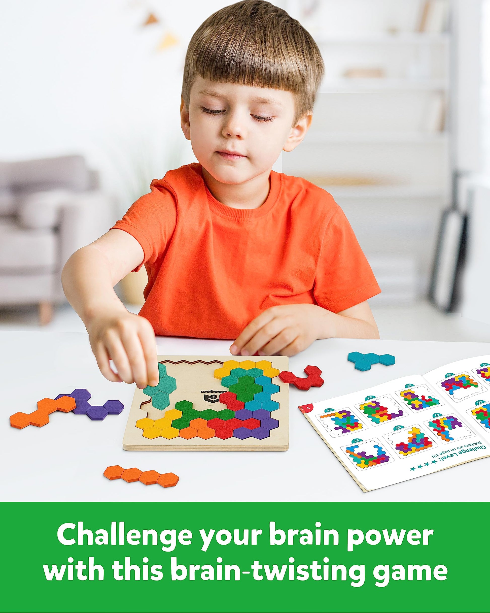 Coogam Wooden Tangram Puzzle, Color Shape Pattern Jigsaw Brain Teasers 3D Logic Iq Game Geometric Blocks Montessori Stem Educational Toys Gift For All Age