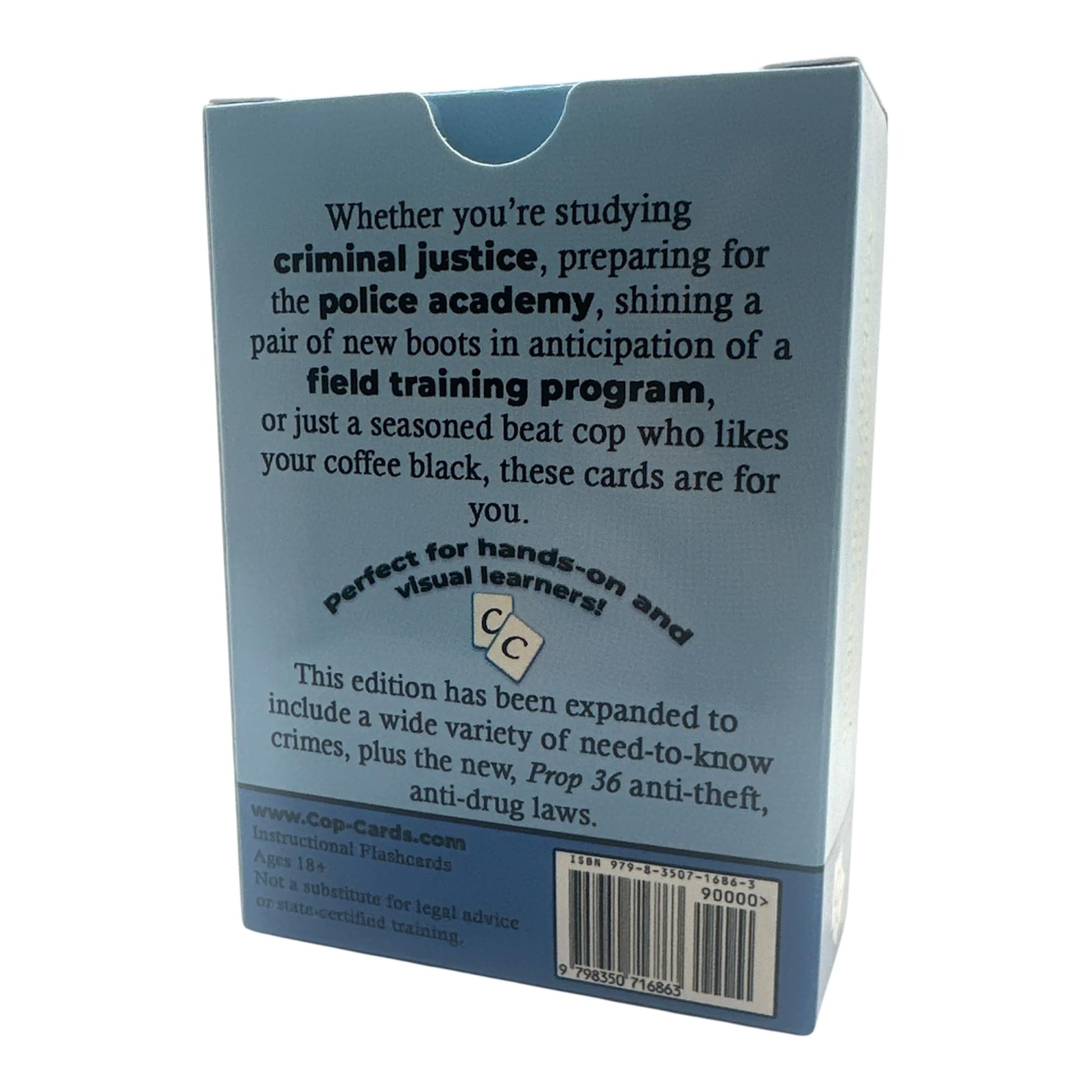 - Q: Are these flashcards suitable for self-study or classroom use? A: Yes, Cop Cards are designed for both self-study and classroom environments. Their visual appeal and easy-to-use format make them ideal for individual learners as well as group instruction in police academies.