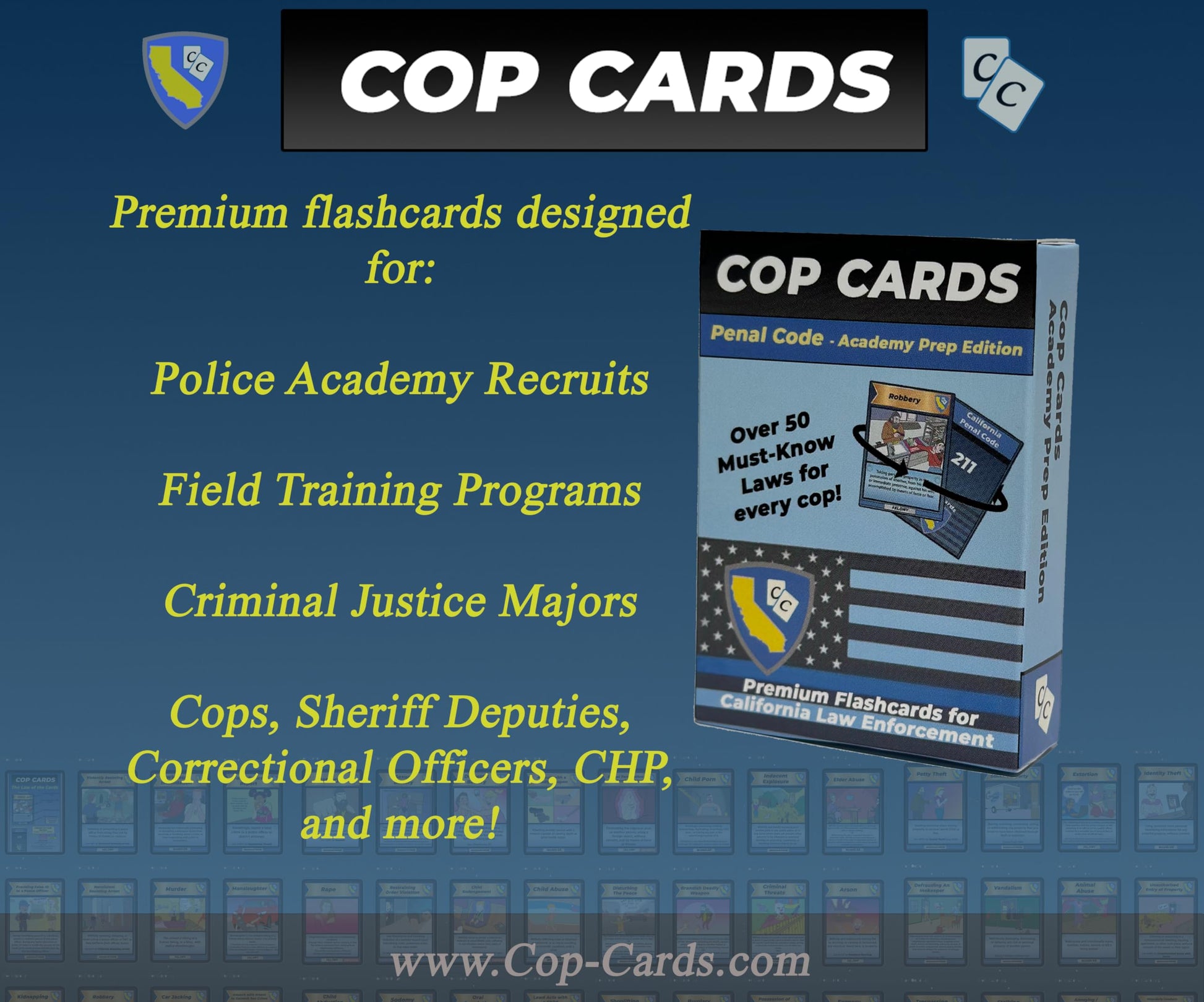 - Q: What are Cop Cards and how can they help law enforcement students? A: Cop Cards are premium flashcards specifically designed for individuals studying California Penal Codes. They serve as an effective learning aid for law enforcement students, providing an engaging way to memorize essential laws that every officer should know.