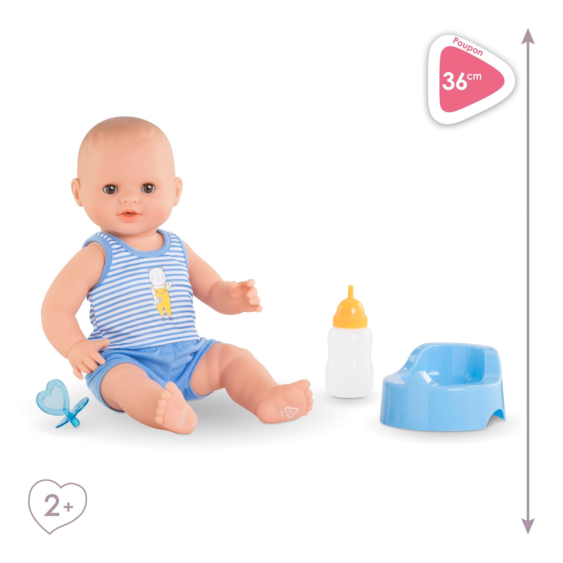 Paul Drink-and-Wet Bath Baby is the perfect choice for little ones wanting a baby doll to care just like real parents. With his own potty; pacifier and refillable bottle (included); Paul is real-life moms and dads potty-training ally! This anatomically correct baby doll: - drinks his bottle - pees in his potty when his tummy is pressed - and takes a bath. Thanks to his all-vinyl body; delicately scented with vanilla; he can even sit up in the water! Measuring 14 inches tall; Paul is just the right size for a young child to hold; cuddle; love and care for like a real baby. His sleeping eyes close when Paul is put down for a nap or at bedtime; like a real baby. He can even suck his thumb; also like a real baby. Paul Drink-and-Wet Bath Baby comes dressed in shorts and a matching striped undershirt. Hes part of the mon grand poupon collection of dolls; fashions and accessories designed to help little ones care for their baby doll like real parents. Ages 2 and up. Note: Corolles Rain Boots (sold separately) do not fit Paul.
