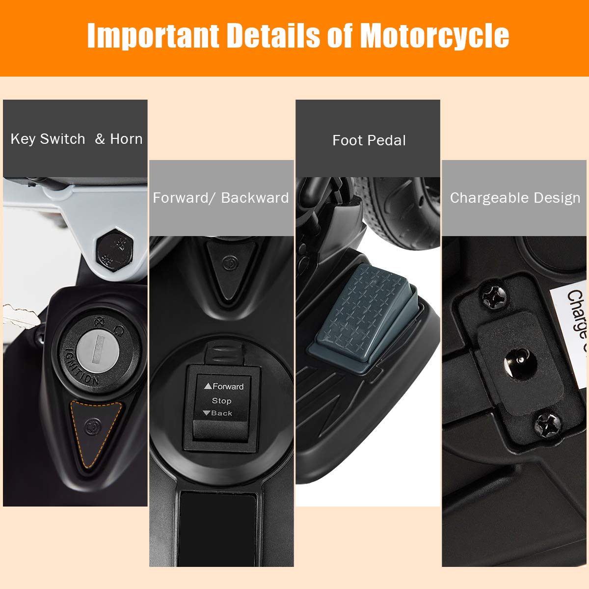 【Simple & Comfortable Driving Experience】Start-up key makes it easy enough for kids to either power or stop the electric motorcycle. Forward and backward function can be realized by means of the foot pedal. And curved seat fitting well with kids’ body curve is capable of improving the level of driving comfortableness. | 【Training Wheels for Higher Stability】There are 2 training wheels which keep the kids dirt motorbike as steady as possible while preventing it from falling over to enable higher stability. Furthermore, the motorcycle is designed with shock absorber spring, assuring it to move smoothly. In this way, you are supposed to trust your kids driving it. | 【Ride on a Variety of Ground】The wheels featuring excellent wear resistance allow kids to ride on all sorts of ground, from wood floor to cement, from plastic racetrack to gravel road. Nearly no limitation to place, kids can enjoy their driving time. Besides, anti-slip tire pattern increases the friction with the road. | 【Music & Stories Cheer up Kids】Our Costzon motorcycle for kids adopts various interesting music and stories to extremely entertain your kids. Or your kids can listen to their preferred music as long as you connect a music device with the USB and MP3 port equipped there. Adjustable volume adds more convenience. In addition, the headlight and tail-light are capable of bringing brightness in darkness. | 【Cool-Looking Gift Ideal for Kids】No need to say, the electric dirt bike for kids with a stylish appearance will attract kid’s attention at first sight, perfect as a birthday, Christmas gift for them. It will accompany your kids and create joyous childhood memories. It is made of selected materials certified by ASTM.